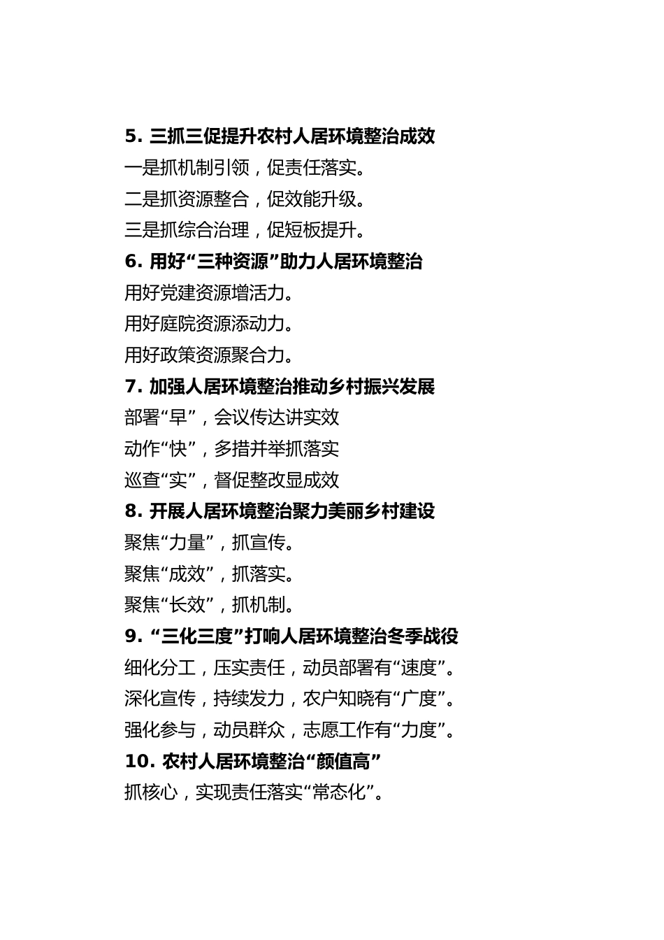 (30例)人居環(huán)境整治寫作提綱1.“”三個(gè)三推進(jìn)人居環(huán)境整治“”三級(jí)聯(lián)動(dòng)激發(fā)合力。一是黨委帶動(dòng)。二是支部推動(dòng)。三是黨員促動(dòng)。“”三個(gè)制度齊抓共管。一是建立縱向包保機(jī)制。二是建立日常管護(hù)機(jī)制。三是建立督查考評(píng)機(jī)制。“”三管齊下宣傳動(dòng)員。一是強(qiáng)化氛圍營造。二是動(dòng)員群眾參與。三是干部示范帶動(dòng)。2.深化人居環(huán)境整治共建和美鄉(xiāng)村畫常態(tài)整治固根本,全域覆蓋提品質(zhì)。宣傳發(fā)動(dòng)聚民心,眾手澆灌文明花。專業(yè)力量強(qiáng)筋骨,精細(xì)管護(hù)保長效。督查考核動(dòng)真格,閉環(huán)管理促落實(shí)。3.“”“”人居環(huán)境整治為鄉(xiāng)村振興提顏增質(zhì)“”成立環(huán)境整治專班,壓實(shí)包保責(zé)任。“”打造多樣...