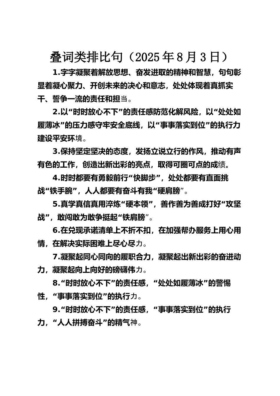 疊詞類排比句(2025年8月3日)1.字字凝聚著解放思想、奮發(fā)進(jìn)取的精神和智慧,句句彰顯著凝心聚力、開創(chuàng)未來的決心和意志,處處體現(xiàn)著真抓實(shí)干、誓爭一流的責(zé)任和擔(dān)當(dāng)。2.“”“以時(shí)時(shí)放心不下的責(zé)任感防范化解風(fēng)險(xiǎn),以處處如”“”履薄冰的壓力感守牢安全底線,以事事落實(shí)到位的執(zhí)行力建設(shè)平安環(huán)境。3.保持堅(jiān)定堅(jiān)決的態(tài)度,發(fā)揚(yáng)立說立行的作風(fēng),推動有聲有色的工作,創(chuàng)造出新出彩的亮點(diǎn),取得可圈可點(diǎn)的成績。4.“”時(shí)時(shí)都要有勇毅前行快腳步,處處都要有直面挑“”“戰(zhàn)鐵手腕,人人都要有奮斗有我硬肩膀”。5.“”“真學(xué)真信真用淬煉硬本領(lǐng),善作善為善成打好攻堅(jiān)”“戰(zhàn)...