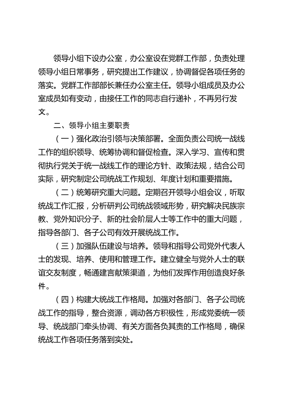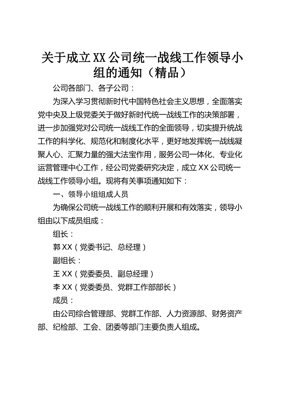 關于成立XX公司統(tǒng)一戰(zhàn)線工作領導小組的通知(精品)公司各部門、各子公司:為深入學習貫徹新時代中國特色社會主義思想,全面落實黨中央及上級黨委關于做好新時代統(tǒng)一戰(zhàn)線工作的決策部署,進一步加強黨對公司統(tǒng)一戰(zhàn)線工作的全面領導,切實提升統(tǒng)戰(zhàn)工作的科學化、規(guī)范化和制度化水平,更好地發(fā)揮統(tǒng)一戰(zhàn)線凝聚人心、匯聚力量的強大法寶作用,服務公司一體化、專業(yè)化運營管理中心工作,經(jīng)公司黨委研究決定,成立XX公司統(tǒng)一戰(zhàn)線工作領導小組?,F(xiàn)將有關事項通知如下:一、領導小組組成人員為確保公司統(tǒng)一戰(zhàn)線工作的順利開展和有效落實,領導小組由以下成員組成:組長:郭XX(黨...