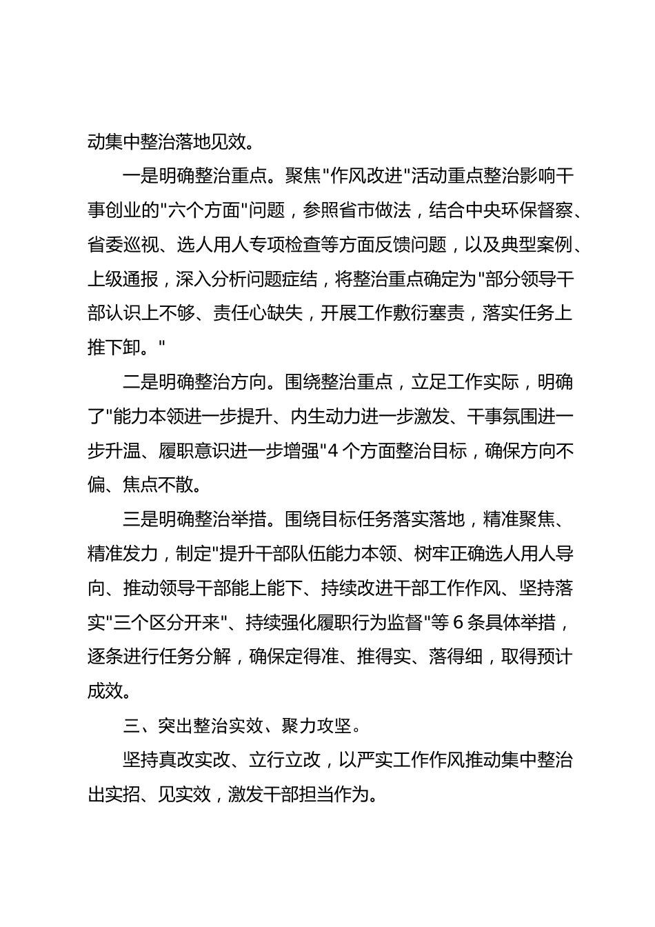 圍繞整治不擔(dān)當(dāng)不作為的匯報(bào)一、深化思想認(rèn)識(shí)、扛起主責(zé)圍繞集中整治目標(biāo)要求,以嚴(yán)的標(biāo)準(zhǔn)、實(shí)的作風(fēng)扎實(shí)推進(jìn)集中整治。一是抓部署調(diào)度。認(rèn)真履行牽頭責(zé)任,精心謀劃、全面部署、深入推進(jìn),通過(guò)理論學(xué)習(xí)中心組、"三會(huì)一課"等形式,深入開(kāi)展交流研討,深化思想認(rèn)識(shí);部務(wù)會(huì)專題研究"不擔(dān)當(dāng)不作為"問(wèn)題,部領(lǐng)導(dǎo)班子和班子成員認(rèn)真對(duì)照、主動(dòng)認(rèn)領(lǐng)、深入查擺、一體推進(jìn)。二是抓調(diào)研推進(jìn)。聚焦整治工作重點(diǎn),圍繞生態(tài)環(huán)保、耕地保護(hù)、信訪反映、軟弱渙散黨組織整頓提升等市委密切關(guān)注、群眾反映強(qiáng)烈的問(wèn)題,深入開(kāi)展調(diào)研,實(shí)地察看、座談了解干部工作思路規(guī)劃和擔(dān)當(dāng)作為情況,...