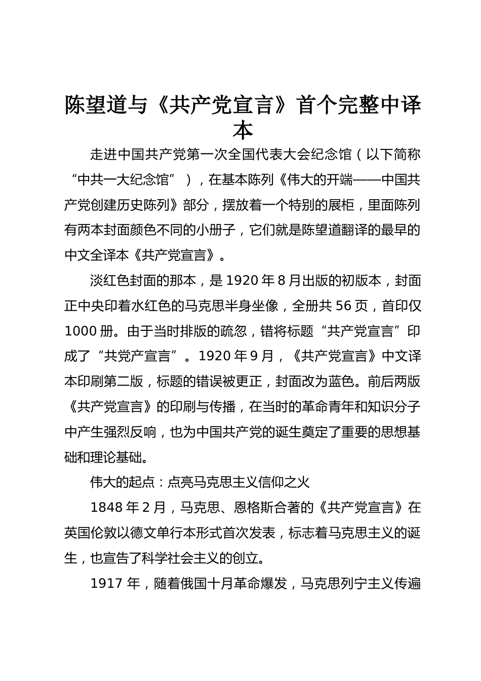陳望道與《共產(chǎn)黨宣言》首個完整中譯本走進中國共產(chǎn)黨第一次全國代表大會紀念館(以下簡稱“中共一大紀念館”),在基本陳列《偉大的開端——中國共產(chǎn)黨創(chuàng)建歷史陳列》部分,擺放著一個特別的展柜,里面陳列有兩本封面顏色不同的小冊子,它們就是陳望道翻譯的最早的中文全譯本《共產(chǎn)黨宣言》。淡紅色封面的那本,是1920年8月出版的初版本,封面正中央印著水紅色的馬克思半身坐像,全冊共56頁,首印僅1000冊。由于當時排版的疏忽,錯將標題“共產(chǎn)黨宣言”印成了“共黨產(chǎn)宣言”。1920年9月,《共產(chǎn)黨宣言》中文譯本印刷第二版,標題的錯誤被更正,封面改為藍色。前后兩版《...