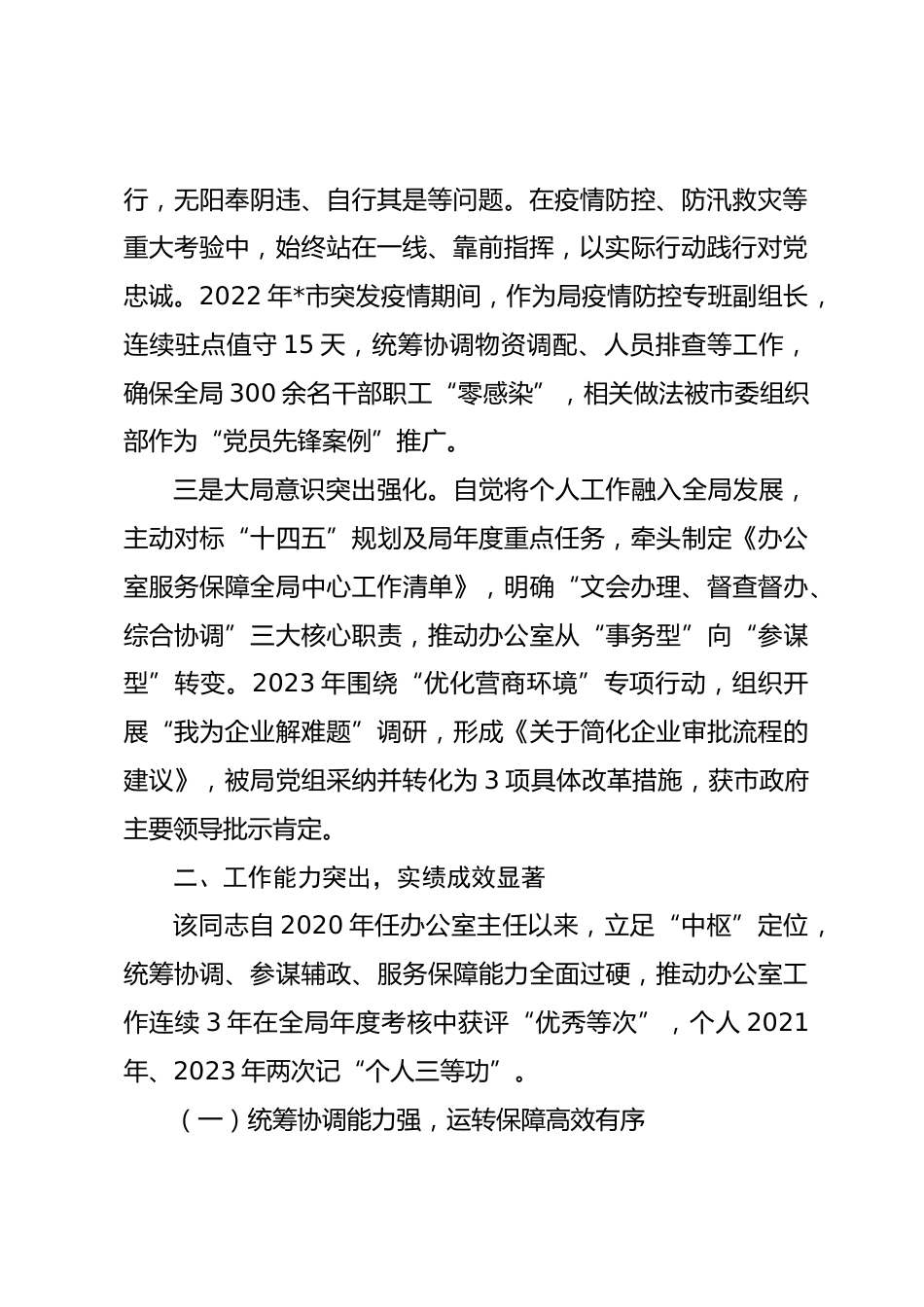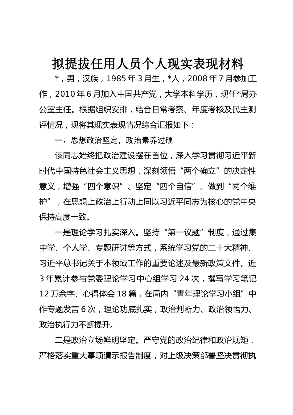 擬提拔任用人員個人現(xiàn)實表現(xiàn)材料*,男,漢族,1985年3月生,*人,2008年7月參加工作,2010年6月加入中國共產(chǎn)黨,大學(xué)本科學(xué)歷,現(xiàn)任*局辦公室主任。根據(jù)組織安排,結(jié)合日??疾?、年度考核及民主測評情況,現(xiàn)將其現(xiàn)實表現(xiàn)情況綜合匯報如下:一、思想政治堅定,政治素養(yǎng)過硬該同志始終把政治建設(shè)擺在首位,深入學(xué)習(xí)貫徹習(xí)近平新時代中國特色社會主義思想,深刻領(lǐng)悟“兩個確立”的決定性意義,增強“四個意識”、堅定“四個自信”、做到“兩個維護”,在思想上政治上行動上同以習(xí)近平同志為核心的黨中央保持高度一致。一是理論學(xué)習(xí)扎實深入。堅持“第一議題”制度,通過集中...