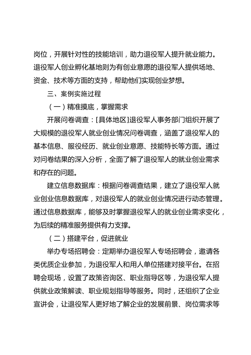 服務(wù)退役軍人就業(yè)創(chuàng)業(yè)創(chuàng)新案例報(bào)告一、案例背景退役軍人是黨和國家的寶貴財(cái)富,是建設(shè)中國特色社會主義的重要力量。近年來,隨著國防和軍隊(duì)改革的深入推進(jìn),每年都有大量退役軍人回到地方。如何幫助他們順利實(shí)現(xiàn)從“戰(zhàn)場”到“職場”的轉(zhuǎn)變,更好地融入社會、發(fā)揮作用,成為了社會關(guān)注的焦點(diǎn)。然而,退役軍人在就業(yè)創(chuàng)業(yè)過程中面臨著諸多困難和挑戰(zhàn)一方面,由于長期服役,他們對地方的就業(yè)市場和行業(yè)發(fā)展情況了解有限,缺乏相關(guān)的職業(yè)技能和工作經(jīng)驗(yàn);另一方面,創(chuàng)業(yè)時(shí)又面臨資金、場地、政策等方面的限制。因此,積極探索服務(wù)退役軍人就業(yè)創(chuàng)業(yè)的有效模式和方法,具有重要...