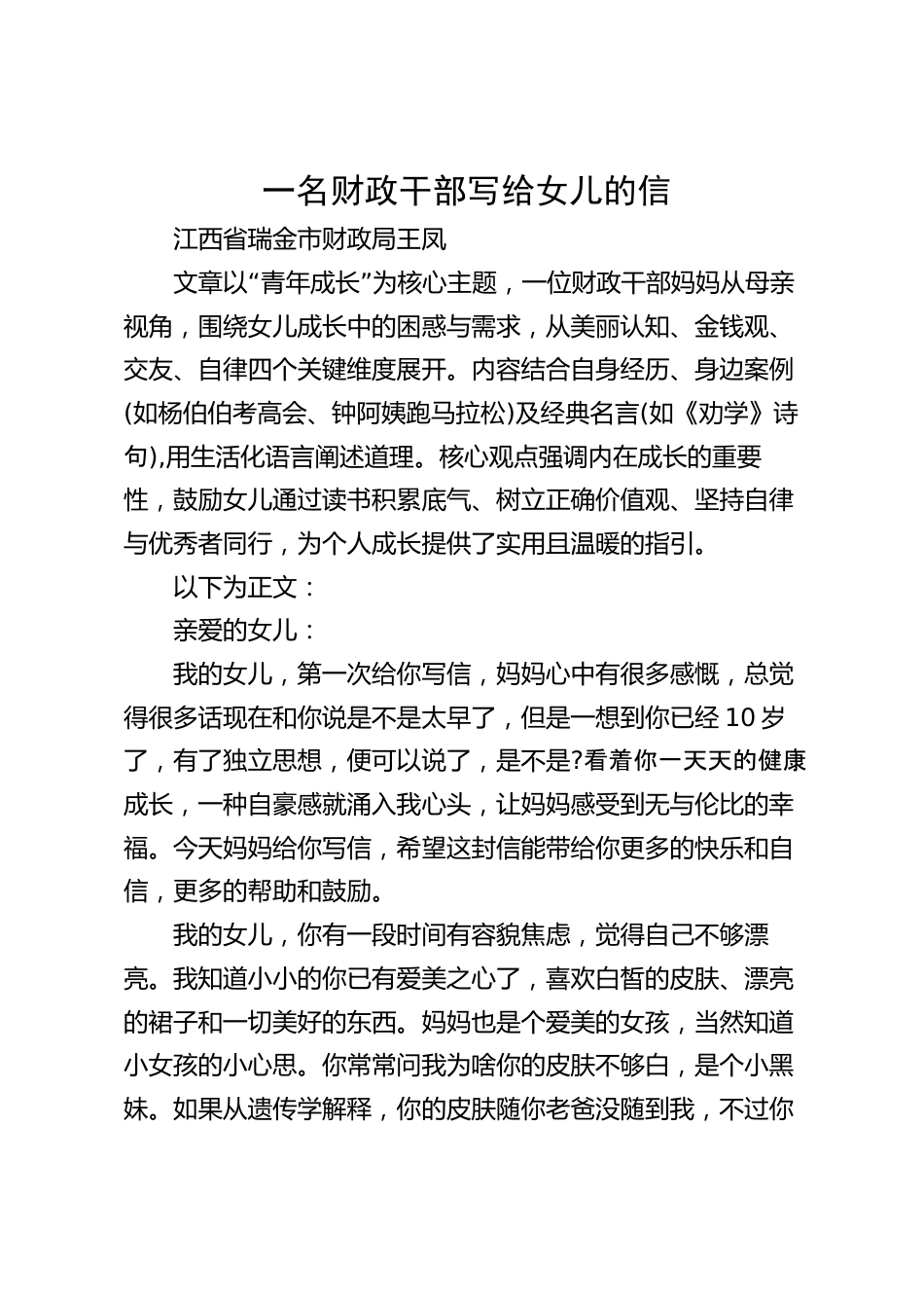 一名財政干部寫給女兒的信江西省瑞金市財政局王鳳“”文章以青年成長為核心主題,一位財政干部媽媽從母親視角,圍繞女兒成長中的困惑與需求,從美麗認(rèn)知、金錢觀、交友、自律四個關(guān)鍵維度展開。內(nèi)容結(jié)合自身經(jīng)歷、身邊案例(如楊伯伯考高會、鐘阿姨跑馬拉松)及經(jīng)典名言(如《勸學(xué)》詩句),用生活化語言闡述道理。核心觀點(diǎn)強(qiáng)調(diào)內(nèi)在成長的重要性,鼓勵女兒通過讀書積累底氣、樹立正確價值觀、堅持自律與優(yōu)秀者同行,為個人成長提供了實(shí)用且溫暖的指引。以下為正文:親愛的女兒:我的女兒,第一次給你寫信,媽媽心中有很多感慨,總覺得很多話現(xiàn)在和你說是不是太早了,但是一想...