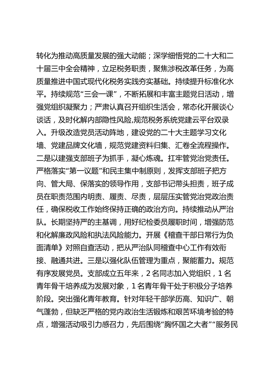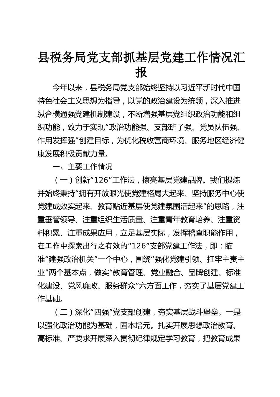 縣稅務(wù)局黨支部抓基層黨建工作情況匯報(bào)今年以來,縣稅務(wù)局黨支部始終堅(jiān)持以習(xí)近平新時(shí)代中國(guó)特色社會(huì)主義思想為指導(dǎo),以黨的政治建設(shè)為統(tǒng)領(lǐng),深入推進(jìn)縱合橫通強(qiáng)黨建機(jī)制建設(shè),不斷增強(qiáng)基層黨組織政治功能和組“織功能,致力于實(shí)現(xiàn)政治功能強(qiáng)、支部班子強(qiáng)、黨員隊(duì)伍強(qiáng)、”作用發(fā)揮強(qiáng)創(chuàng)建目標(biāo),為優(yōu)化稅收營(yíng)商環(huán)境、服務(wù)地區(qū)經(jīng)濟(jì)健康發(fā)展積極貢獻(xiàn)力量。一、主要工作情況“(一)創(chuàng)新126”工作法,擦亮基層黨建品牌。我們提煉“并始終秉持擁有開放眼光使黨建格局大起來、堅(jiān)持服務(wù)中心使”黨建成效實(shí)起來、教育貼近基層使黨建氛圍活起來的思路,注重垂管領(lǐng)導(dǎo)、注重組織生活...