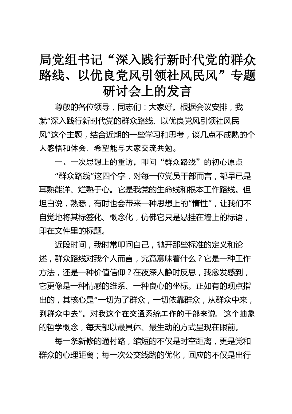 局黨組書記“深入踐行新時(shí)代黨的群眾路線、以優(yōu)良黨風(fēng)引領(lǐng)社風(fēng)民風(fēng)”專題研討會(huì)上的發(fā)言尊敬的各位領(lǐng)導(dǎo),同志們:大家好。根據(jù)會(huì)議安排,我“就深入踐行新時(shí)代黨的群眾路線、以優(yōu)良黨風(fēng)引領(lǐng)社風(fēng)民”風(fēng)這個(gè)主題,結(jié)合近期的一些學(xué)習(xí)和思考,談幾點(diǎn)不成熟的個(gè)人感悟和體會(huì),希望能與大家交流共勉。一、一次思想上的重訪,叩問“群眾路線”的初心原點(diǎn)“”群眾路線這四個(gè)字,對(duì)每一位黨員干部而言,都早已是耳熟能詳、爛熟于心。它是我黨的生命線和根本工作路線。但“”坦白說,熟悉,有時(shí)也會(huì)帶來一種思想上的惰性,讓我們不自覺地將其標(biāo)簽化、概念化,仿佛它只是懸掛在墻上...