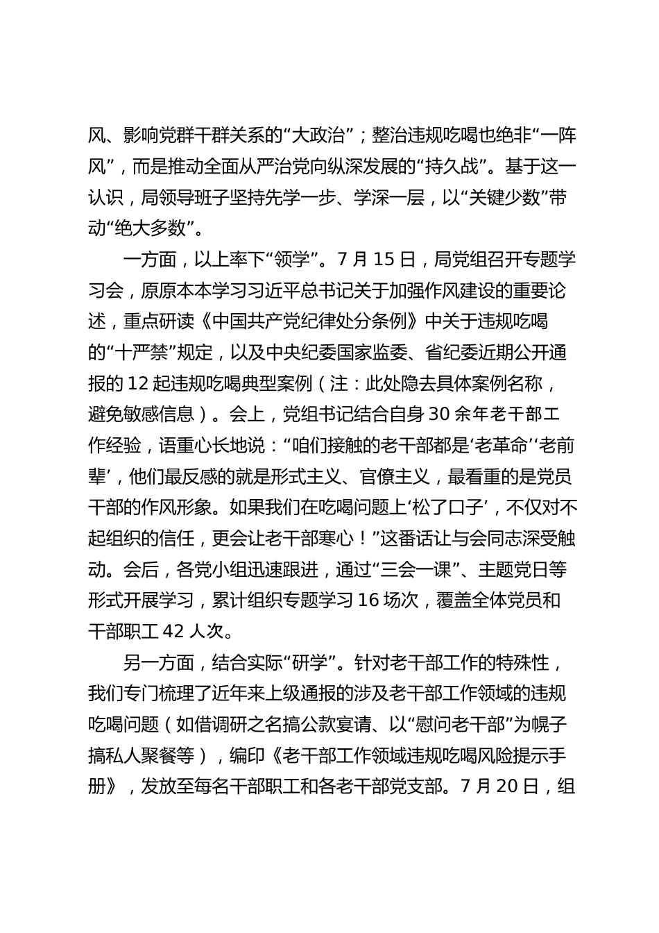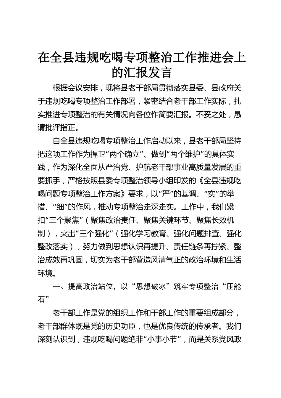 在全縣違規(guī)吃喝專項(xiàng)整治工作推進(jìn)會(huì)上的匯報(bào)發(fā)言根據(jù)會(huì)議安排,現(xiàn)將縣老干部局貫徹落實(shí)縣委、縣政府關(guān)于違規(guī)吃喝專項(xiàng)整治工作部署,緊密結(jié)合老干部工作實(shí)際,扎實(shí)推進(jìn)專項(xiàng)整治的有關(guān)情況向各位作簡(jiǎn)要匯報(bào)。不妥之處,懇請(qǐng)批評(píng)指正。自全縣違規(guī)吃喝專項(xiàng)整治工作啟動(dòng)以來(lái),縣老干部局堅(jiān)持“”“”把這項(xiàng)工作作為捍衛(wèi)兩個(gè)確立、做到兩個(gè)維護(hù)的具體實(shí)踐,作為深化全面從嚴(yán)治黨、護(hù)航老干部事業(yè)高質(zhì)量發(fā)展的重要抓手,嚴(yán)格按照縣委專項(xiàng)整治領(lǐng)導(dǎo)小組印發(fā)的《全縣違規(guī)吃“”“”喝問(wèn)題專項(xiàng)整治工作方案》要求,以嚴(yán)的基調(diào)、實(shí)的舉“”措、細(xì)的作風(fēng),推動(dòng)專項(xiàng)整治走深走實(shí)。工作中...