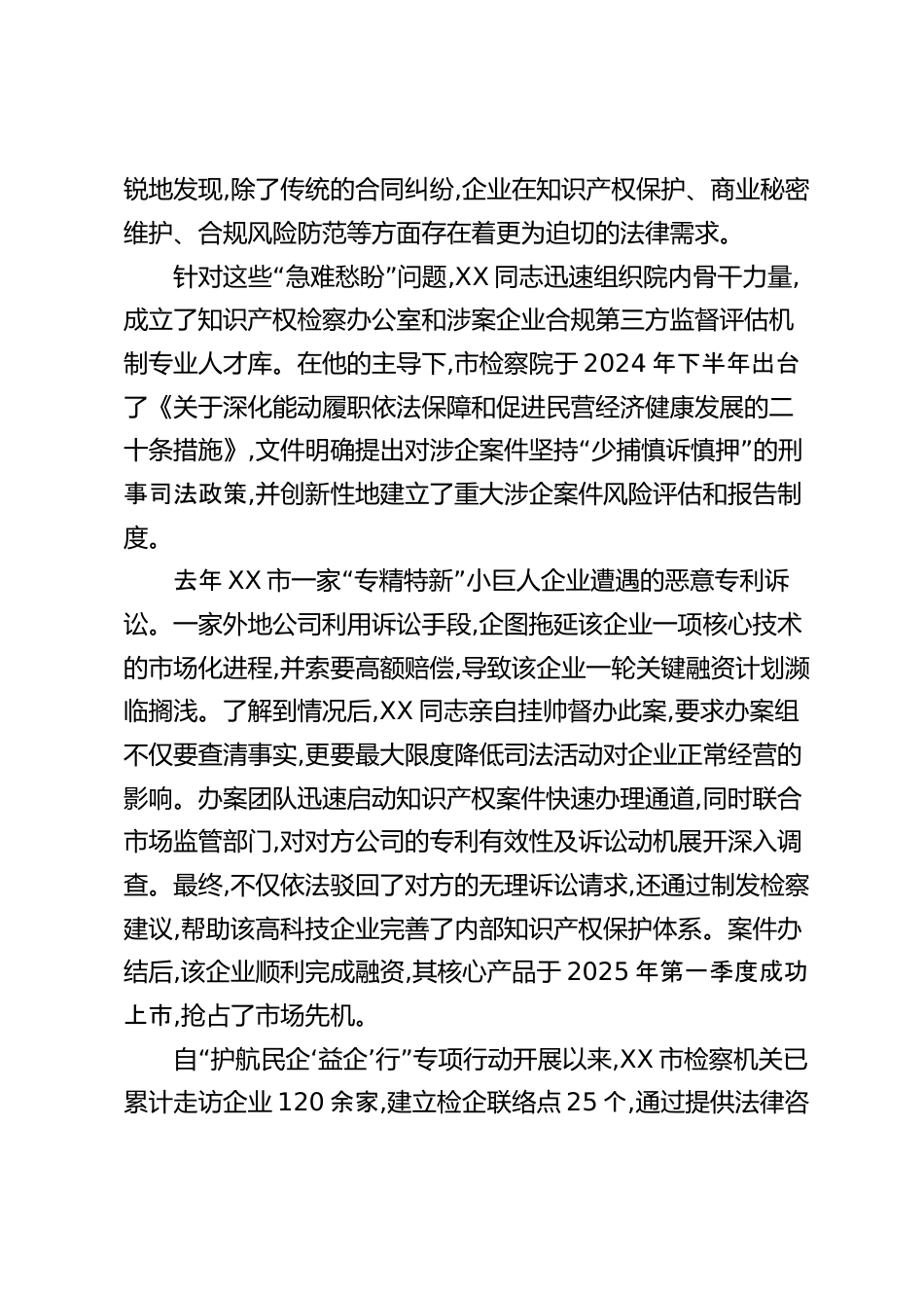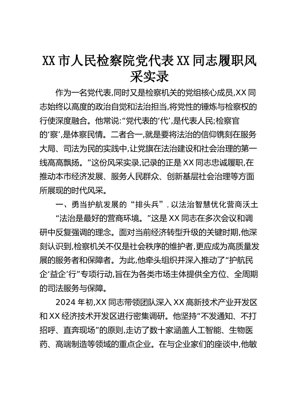 XX市人民檢察院黨代表XX同志履職風采實錄作為一名黨代表,同時又是檢察機關的黨組核心成員,XX同志始終以高度的政治自覺和法治擔當,將黨性的錘煉與檢察權的行使深度融合。他常說:“‘’黨代表的代,是代表人民;檢察官‘’的察,是體察民情。二者合一,就是要將法治的信仰鐫刻在服務大局、司法為民的實踐中,讓黨旗在法治建設和社會治理的第一”線高高飄揚。這份風采實錄,記錄的正是XX同志忠誠履職,在推動本市經濟發(fā)展、服務人民群眾、創(chuàng)新基層社會治理等方面所展現的時代風采。一、勇當護航發(fā)展的“排頭兵”,以法治智慧優(yōu)化營商沃土“”法治是最好的營商環(huán)境。這是XX同志在多次...