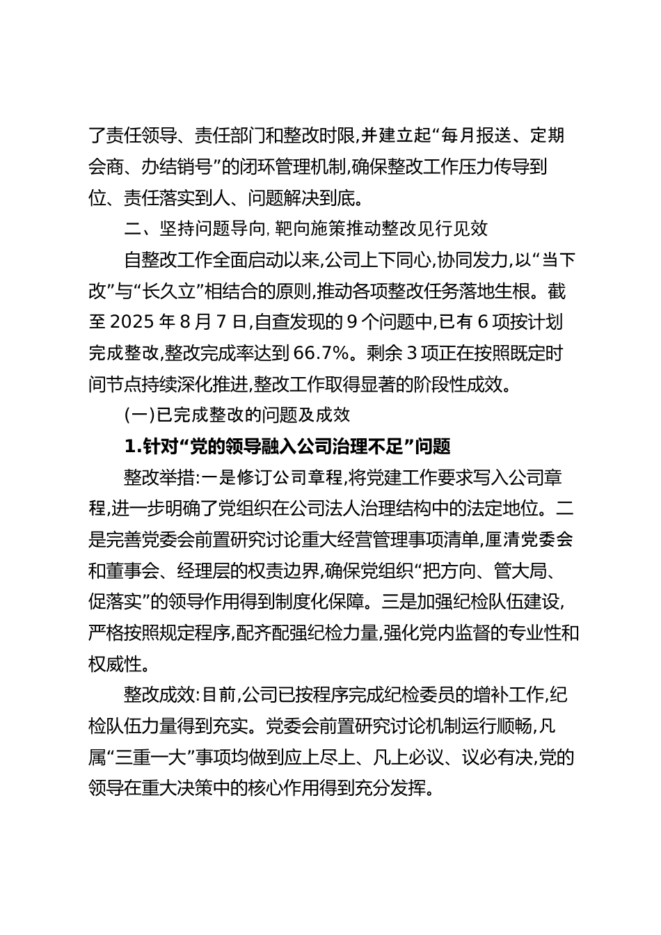 XX公司關(guān)于中央企業(yè)巡視共性問題自查整改落實(shí)情況的報(bào)告根據(jù)上級(jí)黨委關(guān)于對(duì)照中央企業(yè)巡視發(fā)現(xiàn)共性問題清單開展自查整改的工作部署,XX公司黨委高度重視,迅速行動(dòng),以高度的政治自覺和強(qiáng)烈的責(zé)任擔(dān)當(dāng),“”深入開展地毯式自查自糾,并“”以子精神狠抓整改落。將段性成果推情況告釘釘實(shí)現(xiàn)階進(jìn)報(bào)如下。一、提高政治站位,深刻領(lǐng)會(huì)巡視整改重大意義公司黨委深刻認(rèn)識(shí)到,巡視是黨之利劍、國之利器,中央企業(yè)巡視發(fā)現(xiàn)的共性問題,既是全面從嚴(yán)治黨的具體體現(xiàn),也為我們精“”準(zhǔn)畫像,指明了改進(jìn)方向。為此,公司黨委第一時(shí)間召開專題會(huì)議,傳達(dá)學(xué)習(xí)上級(jí)精神,對(duì)照中央企業(yè)巡視發(fā)現(xiàn)的在貫徹...