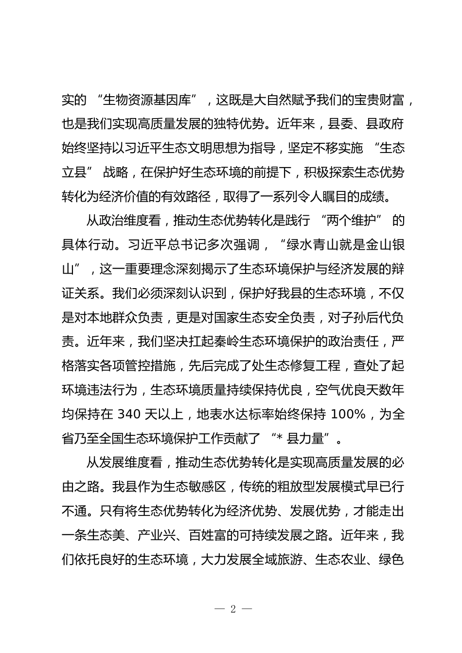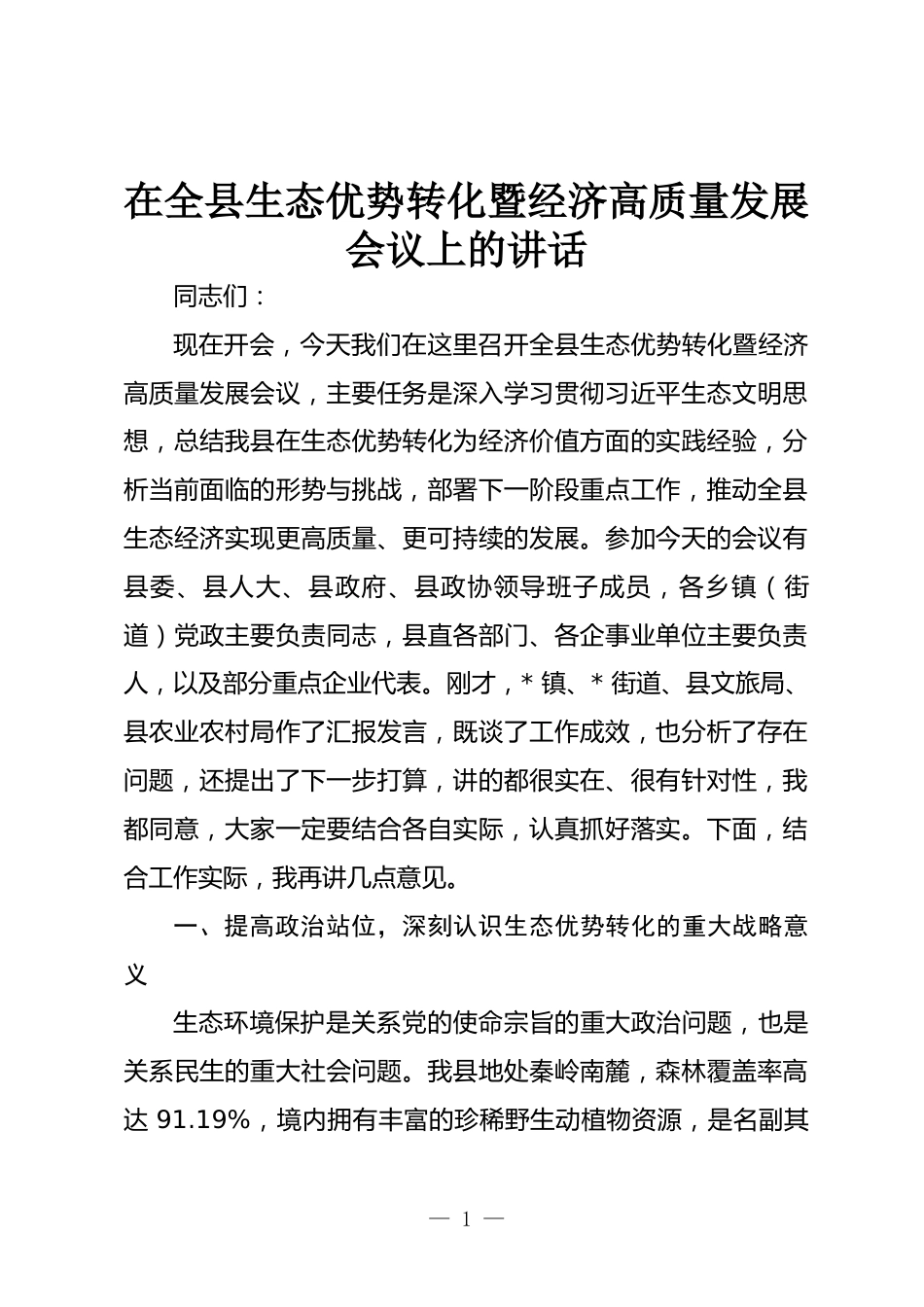 在全縣生態(tài)優(yōu)勢(shì)轉(zhuǎn)化暨經(jīng)濟(jì)高質(zhì)量發(fā)展會(huì)議上的講話同志們:現(xiàn)在開會(huì),今天我們?cè)谶@里召開全縣生態(tài)優(yōu)勢(shì)轉(zhuǎn)化暨經(jīng)濟(jì)高質(zhì)量發(fā)展會(huì)議,主要任務(wù)是深入學(xué)習(xí)貫徹習(xí)近平生態(tài)文明思想,總結(jié)我縣在生態(tài)優(yōu)勢(shì)轉(zhuǎn)化為經(jīng)濟(jì)價(jià)值方面的實(shí)踐經(jīng)驗(yàn),分析當(dāng)前面臨的形勢(shì)與挑戰(zhàn),部署下一階段重點(diǎn)工作,推動(dòng)全縣生態(tài)經(jīng)濟(jì)實(shí)現(xiàn)更高質(zhì)量、更可持續(xù)的發(fā)展。參加今天的會(huì)議有縣委、縣人大、縣政府、縣政協(xié)領(lǐng)導(dǎo)班子成員,各鄉(xiāng)鎮(zhèn)(街道)黨政主要負(fù)責(zé)同志,縣直各部門、各企事業(yè)單位主要負(fù)責(zé)人,以及部分重點(diǎn)企業(yè)代表。剛才,*鎮(zhèn)、*街道、縣文旅局、縣農(nóng)業(yè)農(nóng)村局作了匯報(bào)發(fā)言,既談了工作成效,也分析了...
