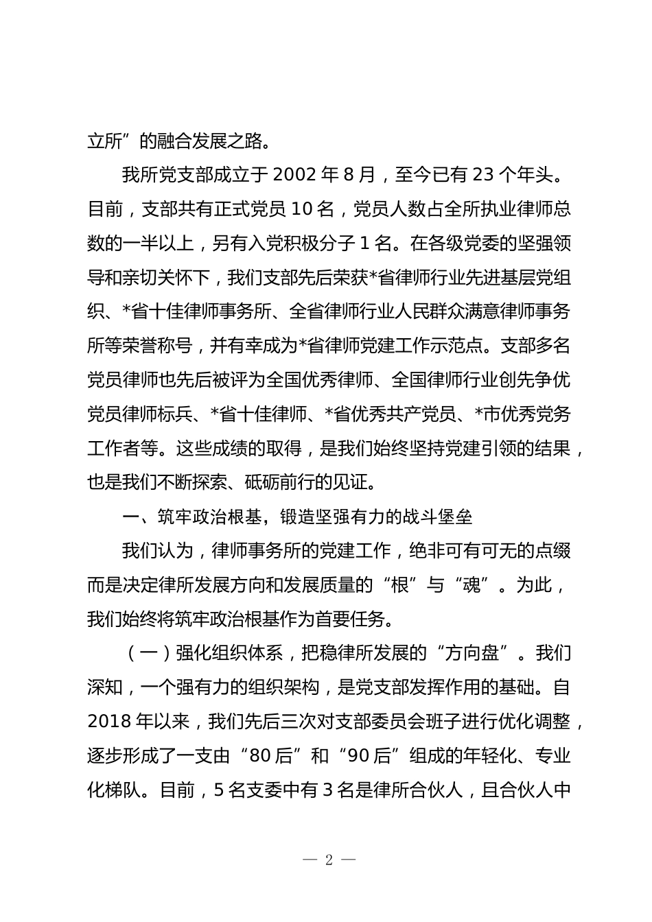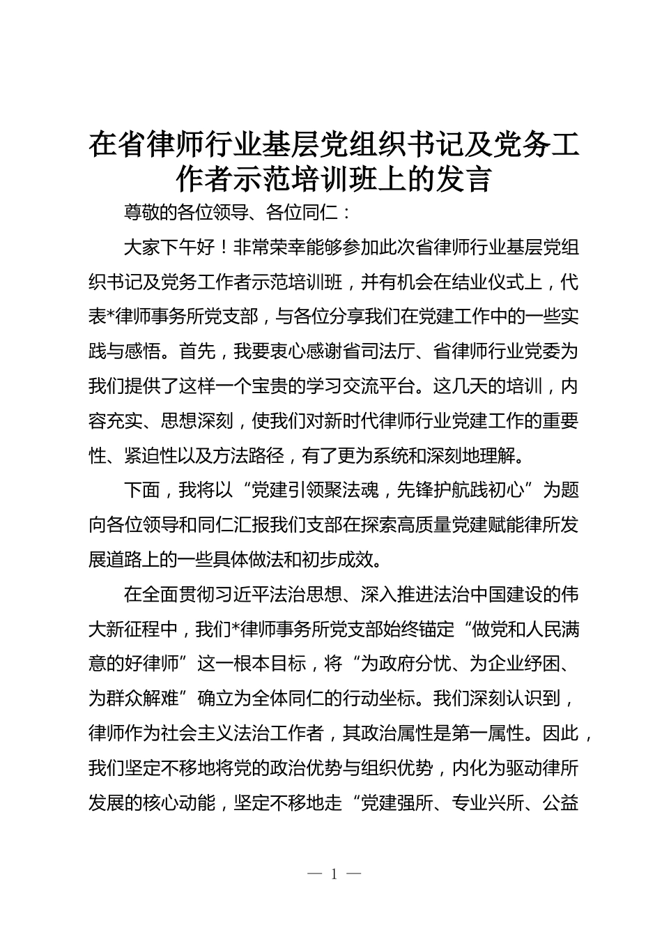 在省律師行業(yè)基層黨組織書(shū)記及黨務(wù)工作者示范培訓(xùn)班上的發(fā)言尊敬的各位領(lǐng)導(dǎo)、各位同仁:大家下午好!非常榮幸能夠參加此次省律師行業(yè)基層黨組織書(shū)記及黨務(wù)工作者示范培訓(xùn)班,并有機(jī)會(huì)在結(jié)業(yè)儀式上,代表*律師事務(wù)所黨支部,與各位分享我們?cè)邳h建工作中的一些實(shí)踐與感悟。首先,我要衷心感謝省司法廳、省律師行業(yè)黨委為我們提供了這樣一個(gè)寶貴的學(xué)習(xí)交流平臺(tái)。這幾天的培訓(xùn),內(nèi)容充實(shí)、思想深刻,使我們對(duì)新時(shí)代律師行業(yè)黨建工作的重要性、緊迫性以及方法路徑,有了更為系統(tǒng)和深刻地理解。下面,我將以“黨建引領(lǐng)聚法魂,先鋒護(hù)航踐初心”為題向各位領(lǐng)導(dǎo)和同仁匯報(bào)我們支...