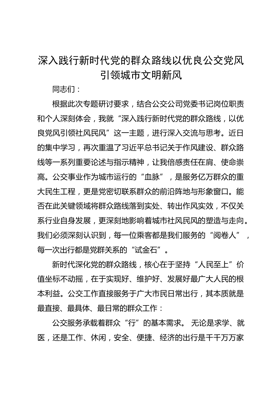 公交公司黨委書記“深入踐行新時代黨的群眾路線 以優(yōu)良黨風引領社風民風”研討發(fā)言材料VIP免費