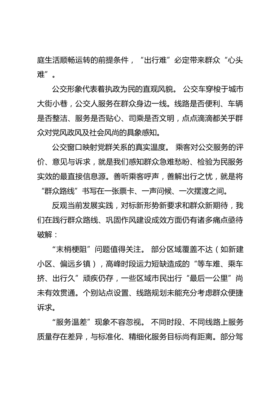 深入踐行新時代黨的群眾路線以優(yōu)良公交黨風引領城市文明新風同志們:根據(jù)此次專題研討要求,結合公交公司黨委書記崗位職責和個人深刻體會,我就“深入踐行新時代黨的群眾路線,以優(yōu)良黨風引領社風民風”這一主題,進行深入交流與思考。近日的集中學習,再次重溫了習近平總書記關于作風建設、群眾路線等一系列重要論述與指示精神,讓我倍感責任在肩、使命崇高。公交事業(yè)作為城市運行的“血脈”,是服務億萬群眾的重大民生工程,更是黨密切聯(lián)系群眾的前沿陣地與形象窗口。能否在此關鍵領域將群眾路線落到實處、轉出作風實效,不僅關系行業(yè)自身發(fā)展,更深刻地影響著城市社風...