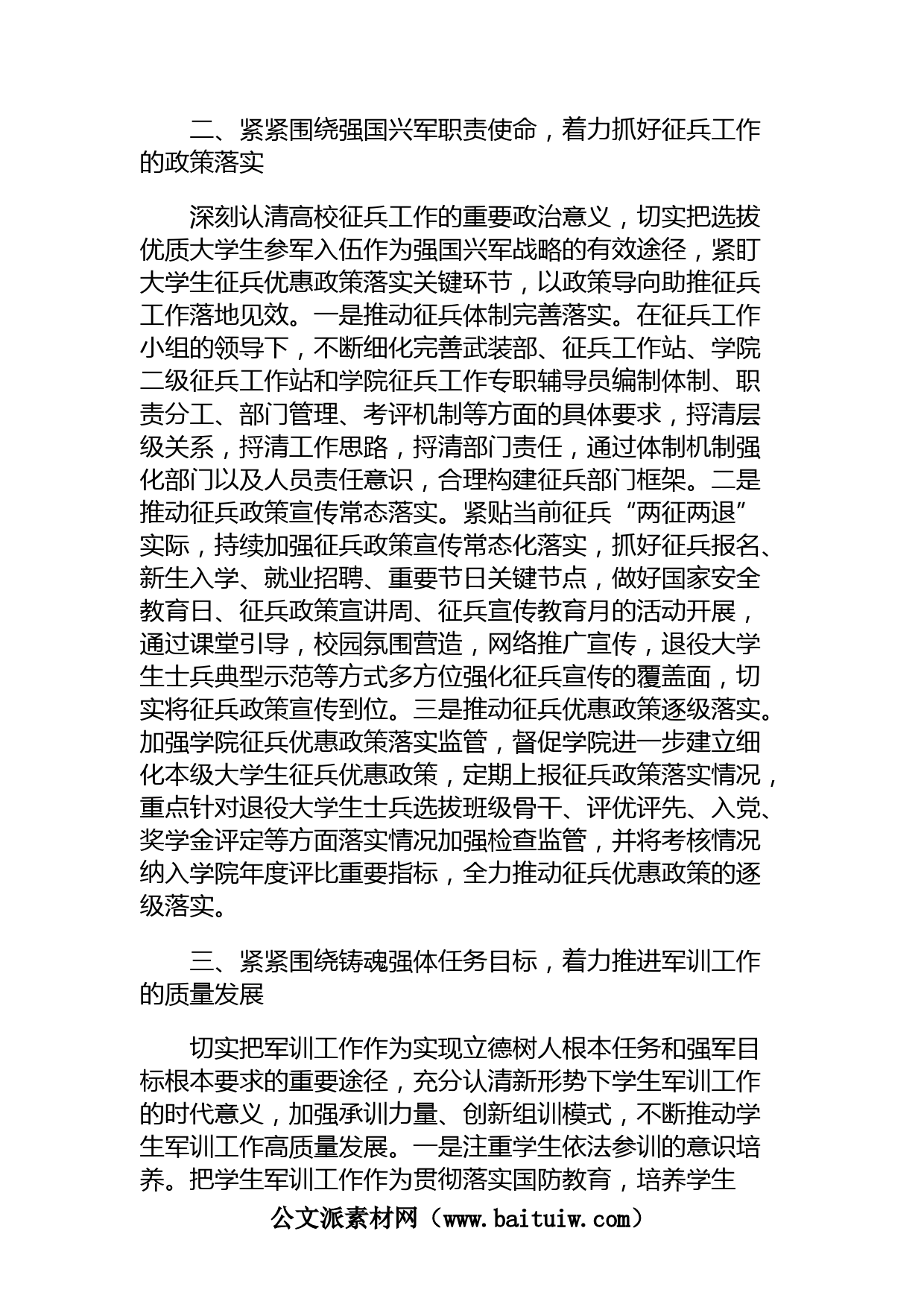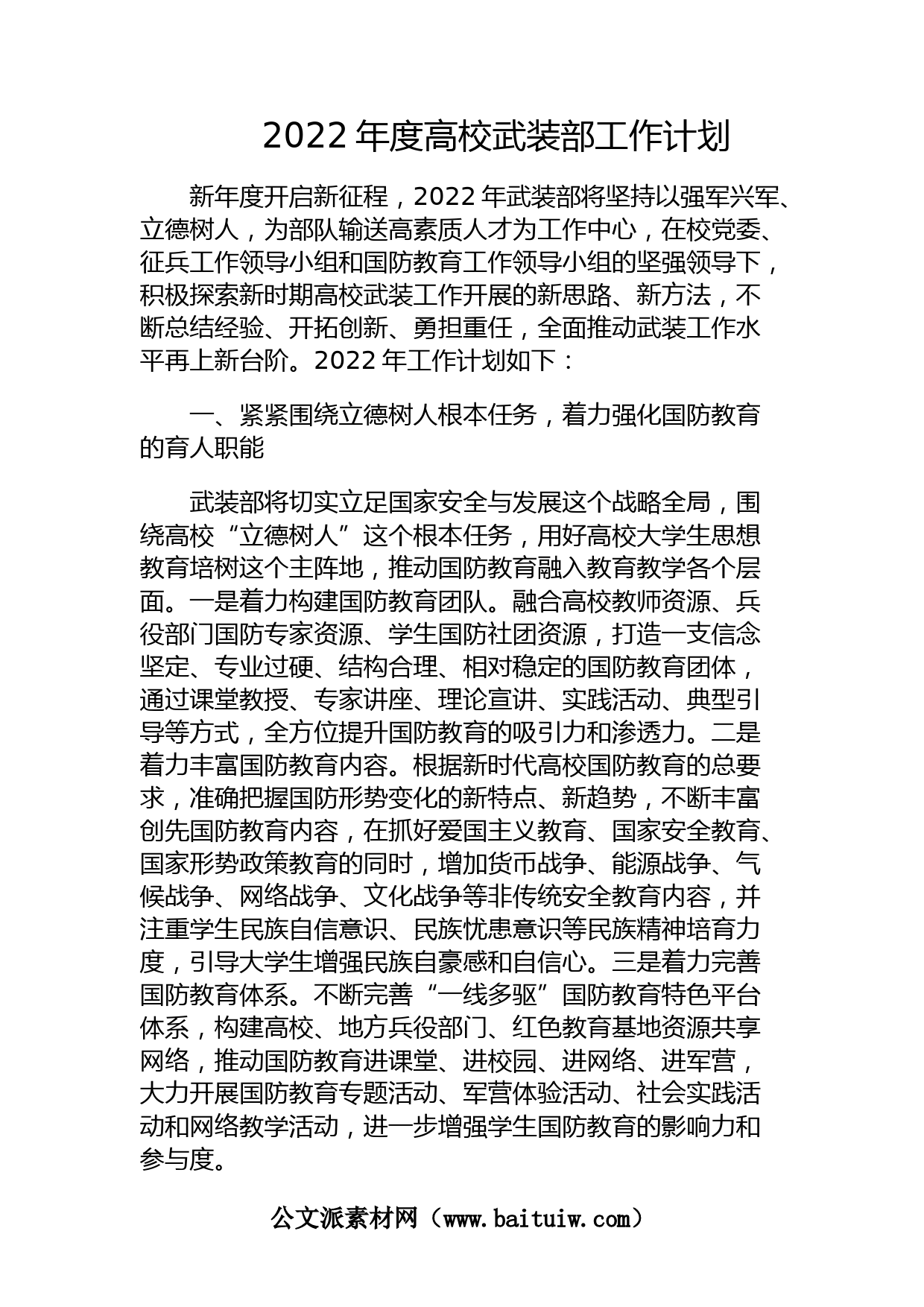 2022年度高校武裝部工作計(jì)劃新年度開啟新征程,2022年武裝部將堅(jiān)持以強(qiáng)軍興軍、立德樹人,為部隊(duì)輸送高素質(zhì)人才為工作中心,在校黨委、征兵工作領(lǐng)導(dǎo)小組和國防教育工作領(lǐng)導(dǎo)小組的堅(jiān)強(qiáng)領(lǐng)導(dǎo)下,積極探索新時(shí)期高校武裝工作開展的新思路、新方法,不斷總結(jié)經(jīng)驗(yàn)、開拓創(chuàng)新、勇?lián)厝?,全面推?dòng)武裝工作水平再上新臺(tái)階。2022年工作計(jì)劃如下:一、緊緊圍繞立德樹人根本任務(wù),著力強(qiáng)化國防教育的育人職能武裝部將切實(shí)立足國家安全與發(fā)展這個(gè)戰(zhàn)略全局,圍繞高?!傲⒌聵淙恕边@個(gè)根本任務(wù),用好高校大學(xué)生思想教育培樹這個(gè)主陣地,推動(dòng)國防教育融入教育教學(xué)各個(gè)層面。一是著力構(gòu)建...
