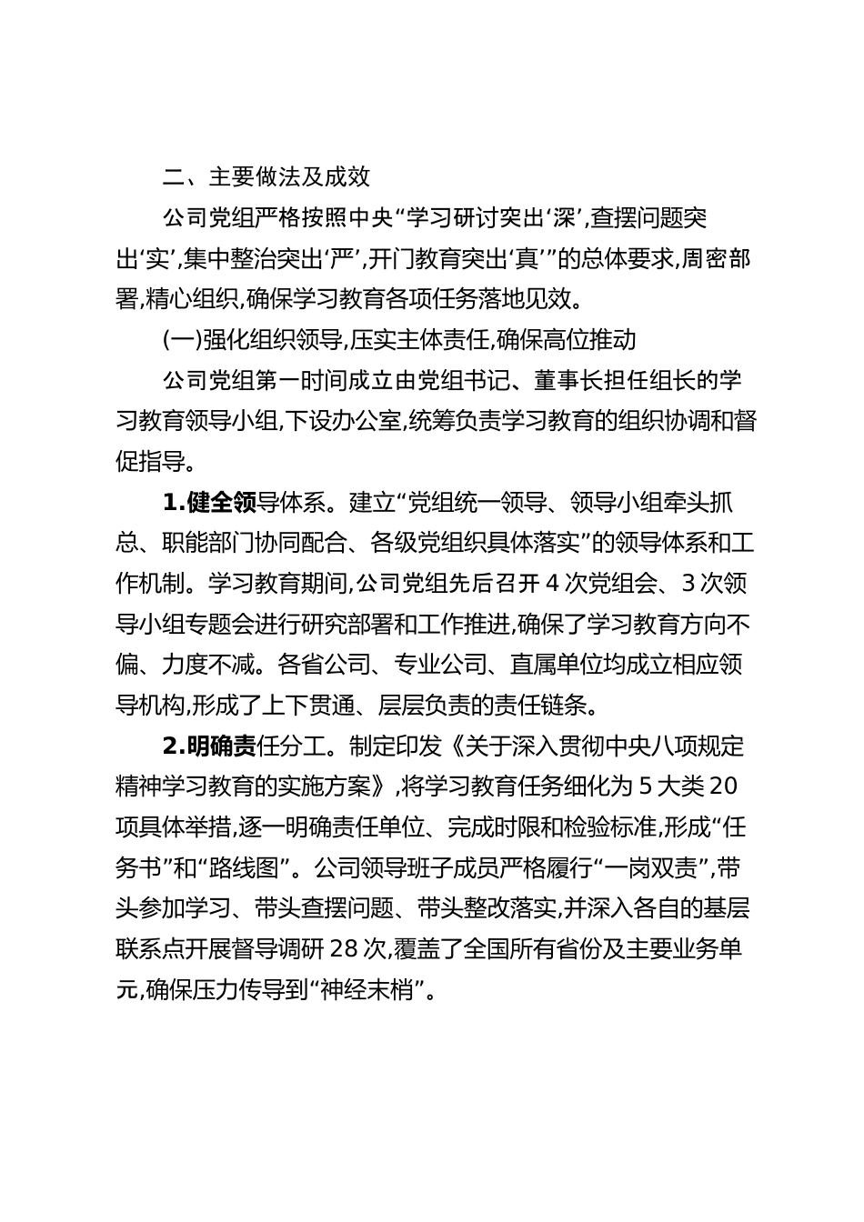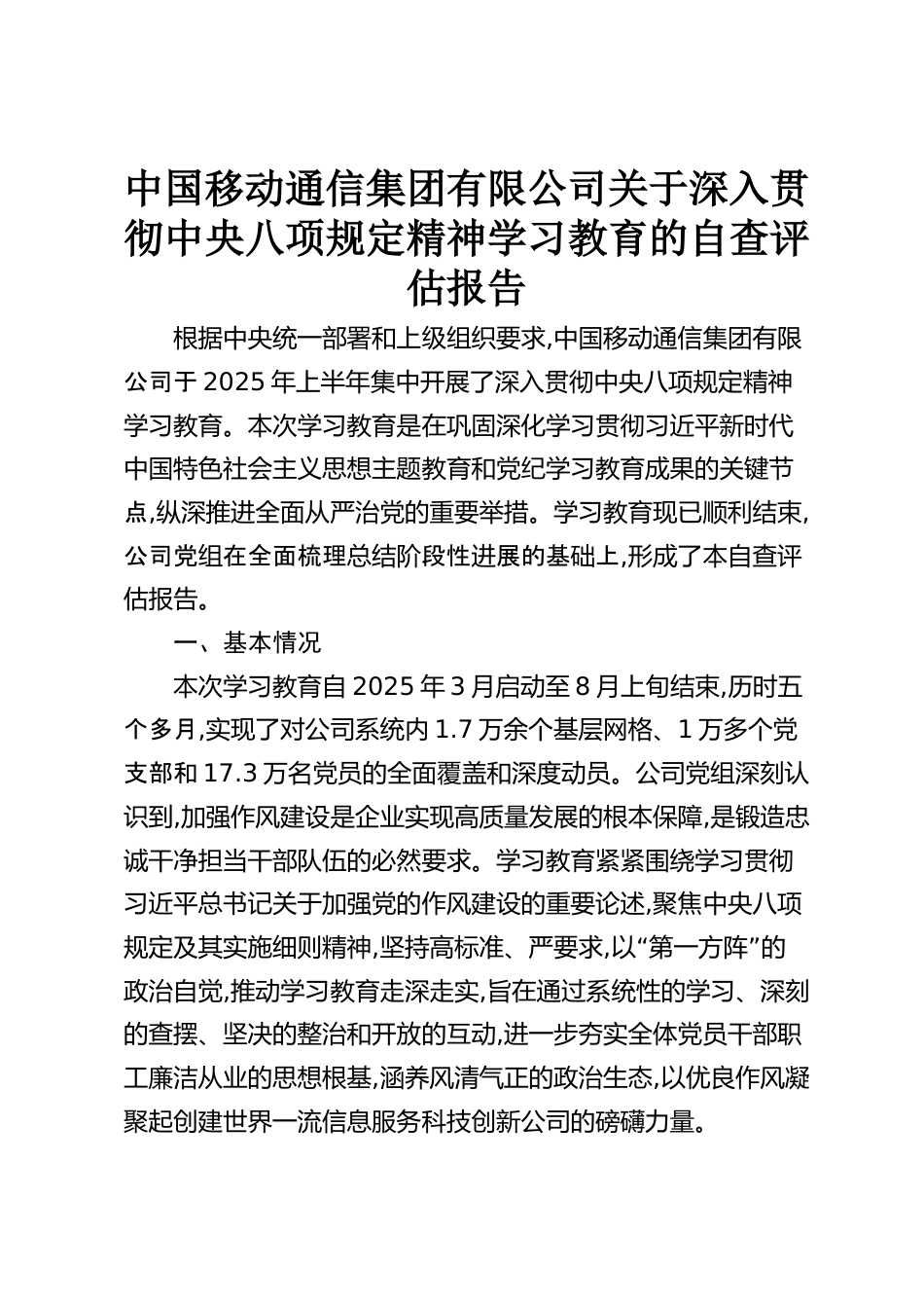 中國移動通信集團有限公司關(guān)于深入貫徹中央八項規(guī)定精神學(xué)習(xí)教育的自查評估報告根據(jù)中央統(tǒng)一部署和上級組織要求,中國移動通信集團有限公司于2025年上半年集中開展了深入貫徹中央八項規(guī)定精神學(xué)習(xí)教育。本次學(xué)習(xí)教育是在鞏固深化學(xué)習(xí)貫徹習(xí)近平新時代中國特色社會主義思想主題教育和黨紀(jì)學(xué)習(xí)教育成果的關(guān)鍵節(jié)點,縱深推進(jìn)全面從嚴(yán)治黨的重要舉措。學(xué)習(xí)教育現(xiàn)已順利結(jié)束,公司黨在全面梳理段性展的基上組總結(jié)階進(jìn)礎(chǔ),形成了本自查評估報告。一、基本情況本次學(xué)習(xí)教育自2025年3月啟動至8月上旬結(jié)束,歷時五個多月,實現(xiàn)了對公司系統(tǒng)內(nèi)1.7萬余個基層網(wǎng)格、1萬多個黨支部和17.3萬名...
