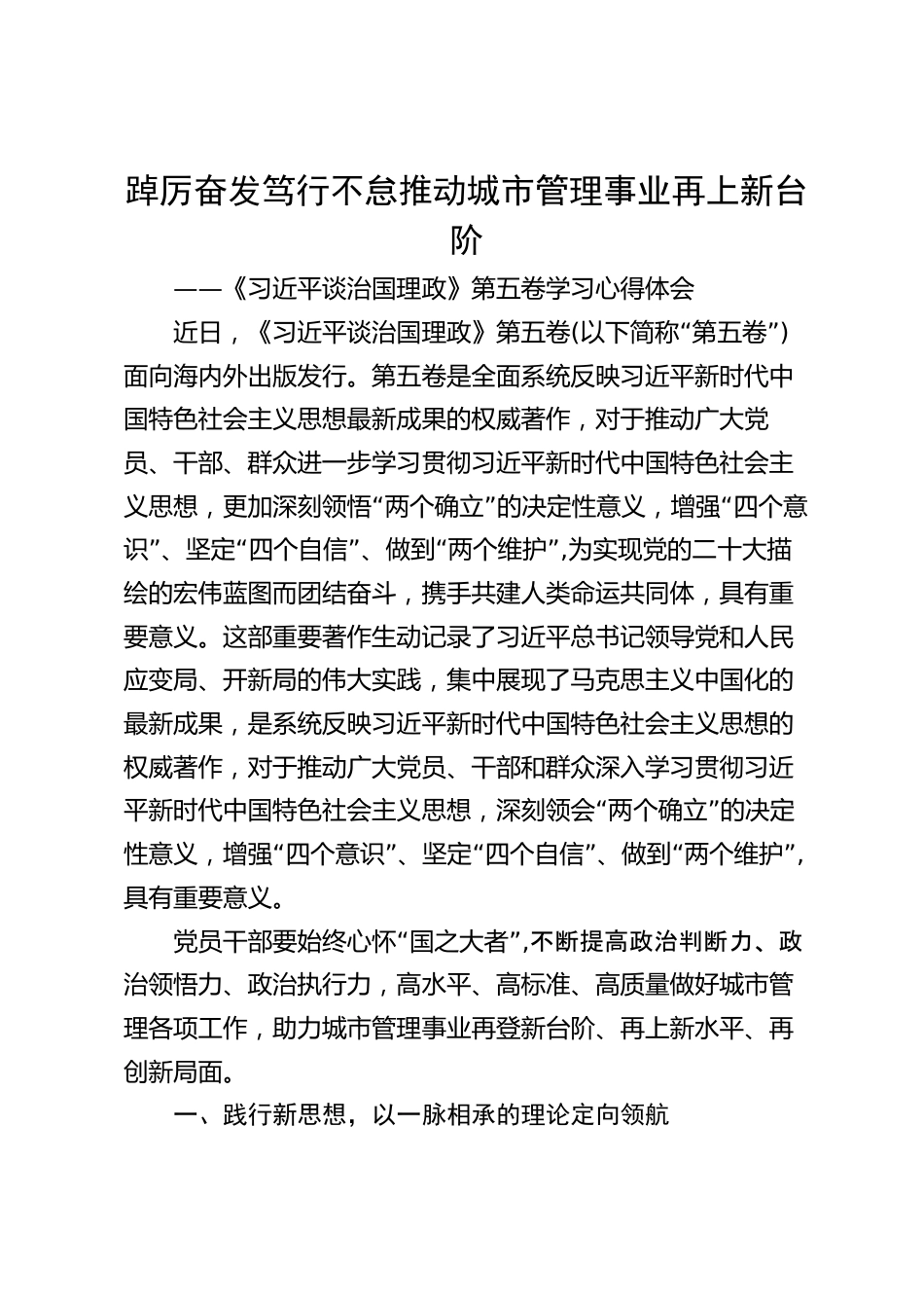 踔厲奮發(fā)篤行不怠推動城市管理事業(yè)再上新臺階——《習近平談治國理政》第五卷學習心得體會近日,《習近平談治國理政》第五卷(“”以下簡稱第五卷)面向海內(nèi)外出版發(fā)行。第五卷是全面系統(tǒng)反映習近平新時代中國特色社會主義思想最新成果的權(quán)威著作,對于推動廣大黨員、干部、群眾進一步學習貫徹習近平新時代中國特色社會主“”“義思想,更加深刻領(lǐng)悟兩個確立的決定性意義,增強四個意”“”“”識、堅定四個自信、做到兩個維護,為實現(xiàn)黨的二十大描繪的宏偉藍圖而團結(jié)奮斗,攜手共建人類命運共同體,具有重要意義。這部重要著作生動記錄了習近平總書記領(lǐng)導黨和人民應變局、...