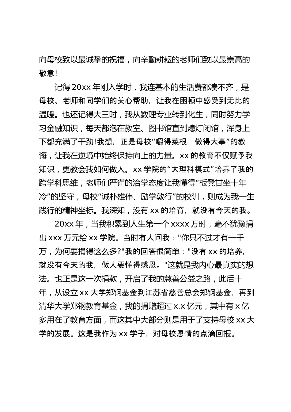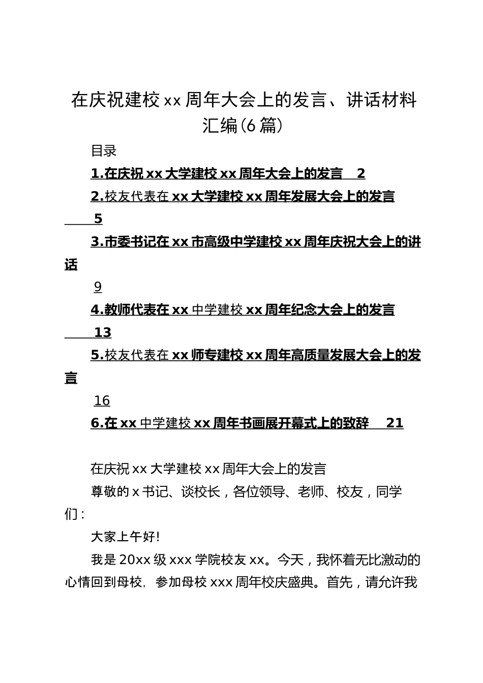 在慶祝建校xx周年大會上的發(fā)言、講話材料匯編(6篇)目錄1.在慶祝xx大學(xué)建校xx周年大會上的發(fā)言22.校友代表在xx大學(xué)建校xx周年發(fā)展大會上的發(fā)言53.市委書記在xx市高級中學(xué)建校xx周年慶祝大會上的講話94.教師代表在xx中學(xué)建校xx周年紀念大會上的發(fā)言135.校友代表在xx師專建校xx周年高質(zhì)量發(fā)展大會上的發(fā)言166.在xx中學(xué)建校xx周年書畫展開幕式上的致辭21在慶祝xx大學(xué)建校xx周年大會上的發(fā)言尊敬的x書記、談校長,各位領(lǐng)導(dǎo)、老師、校友,同學(xué)們:大家上午好!我是20xx級xxx學(xué)院校友xx。今天,我懷著無比激動的心情回到母校,參加母校xxx周年校慶盛典。首先,請允許我向母校致以...