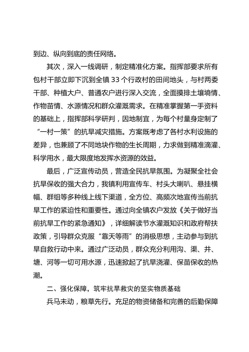 XX鎮(zhèn)關(guān)于2025年度抗旱保收工作的專項(xiàng)報告當(dāng)前,我鎮(zhèn)正面臨一段時期以來持續(xù)高溫少雨的嚴(yán)峻天氣挑戰(zhàn),旱情發(fā)展迅速,對秋糧生產(chǎn)構(gòu)成了嚴(yán)重威脅。為深入貫徹落實(shí)上級關(guān)于防災(zāi)減災(zāi)和糧食安全生產(chǎn)的重要指示精神,我鎮(zhèn)黨委、政府迅速響應(yīng),堅(jiān)持“人民至上、生命至上”的原則,將抗旱保收作為當(dāng)前壓倒一切的中心工作,全面動員、科學(xué)施策,舉全鎮(zhèn)之力打好這場抗旱保收攻堅(jiān)戰(zhàn)?,F(xiàn)將我鎮(zhèn)近期工作情況匯報如下。一、高度重視,構(gòu)建統(tǒng)一高效的應(yīng)急指揮體系面對嚴(yán)峻的旱情形勢,我鎮(zhèn)第一時間啟動抗旱應(yīng)急響應(yīng)機(jī)制,確保各項(xiàng)工作有條不紊、高效運(yùn)轉(zhuǎn)。首先,強(qiáng)化組織領(lǐng)導(dǎo),壓實(shí)各級責(zé)...