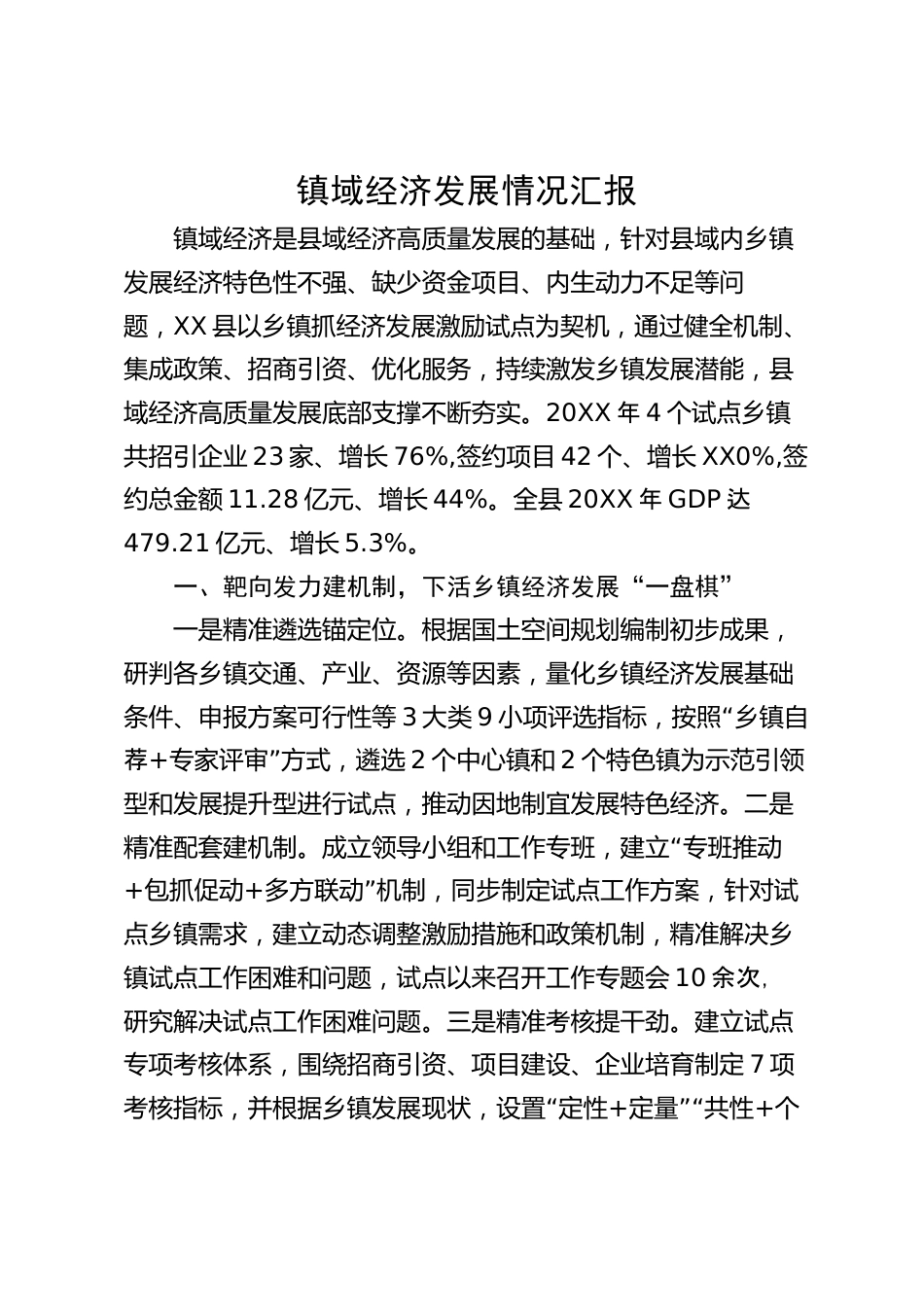 鎮(zhèn)域經(jīng)濟發(fā)展情況匯報鎮(zhèn)域經(jīng)濟是縣域經(jīng)濟高質(zhì)量發(fā)展的基礎,針對縣域內(nèi)鄉(xiāng)鎮(zhèn)發(fā)展經(jīng)濟特色性不強、缺少資金項目、內(nèi)生動力不足等問題,XX縣以鄉(xiāng)鎮(zhèn)抓經(jīng)濟發(fā)展激勵試點為契機,通過健全機制、集成政策、招商引資、優(yōu)化服務,持續(xù)激發(fā)鄉(xiāng)鎮(zhèn)發(fā)展?jié)撃埽h域經(jīng)濟高質(zhì)量發(fā)展底部支撐不斷夯實。20XX年4個試點鄉(xiāng)鎮(zhèn)共招引企業(yè)23家、增長76%,簽約項目42個、增長XX0%,簽約總金額11.28億元、增長44%。全縣20XX年GDP達479.21億元、增長5.3%。一、靶向發(fā)力建機制,下活鄉(xiāng)鎮(zhèn)經(jīng)濟發(fā)展“一盤棋”一是精準遴選錨定位。根據(jù)國土空間規(guī)劃編制初步成果,研判各鄉(xiāng)鎮(zhèn)交通、產(chǎn)業(yè)、資源等因素,量化鄉(xiāng)...