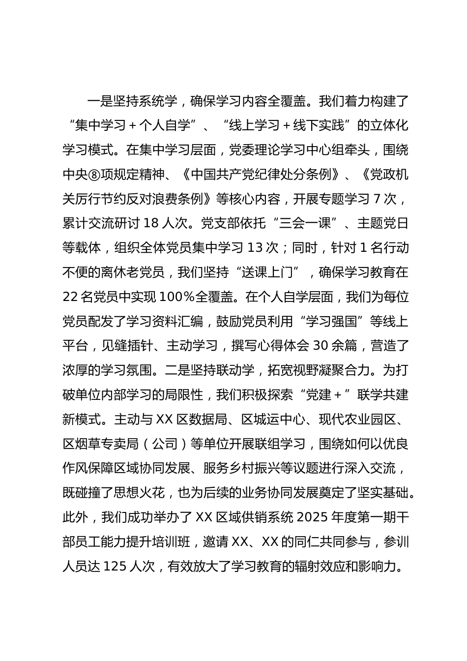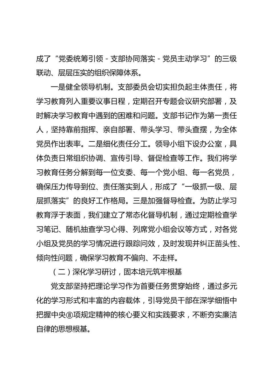 (5篇)深入開(kāi)展貫徹落實(shí)學(xué)習(xí)教育工作總結(jié)匯報(bào)參考范文(一)自學(xué)習(xí)教育啟動(dòng)以來(lái),XX黨支部嚴(yán)格按照上級(jí)黨委的統(tǒng)一部署,將深入學(xué)習(xí)貫徹中央⑧項(xiàng)規(guī)定及其實(shí)施細(xì)則精神作為一項(xiàng)重要的政治任務(wù)抓緊抓實(shí)。通過(guò)為期4月的集中學(xué)習(xí)教育,支部全體黨員干部的政治判斷力、政治領(lǐng)悟力、政治執(zhí)行力得到顯著增強(qiáng),紀(jì)律意識(shí)和規(guī)矩意識(shí)進(jìn)一步筑牢,工作作風(fēng)持續(xù)向好,為推動(dòng)XX事業(yè)高質(zhì)量發(fā)展提供了堅(jiān)強(qiáng)的作風(fēng)保障?,F(xiàn)將本次學(xué)習(xí)教育的開(kāi)展情況、存在問(wèn)題及下步打算總結(jié)如下。一、學(xué)習(xí)教育開(kāi)展情況本次學(xué)習(xí)教育,黨支部堅(jiān)持高標(biāo)準(zhǔn)、嚴(yán)要求,精心組織、周密部署,確保學(xué)習(xí)教育全過(guò)程扎實(shí)推...