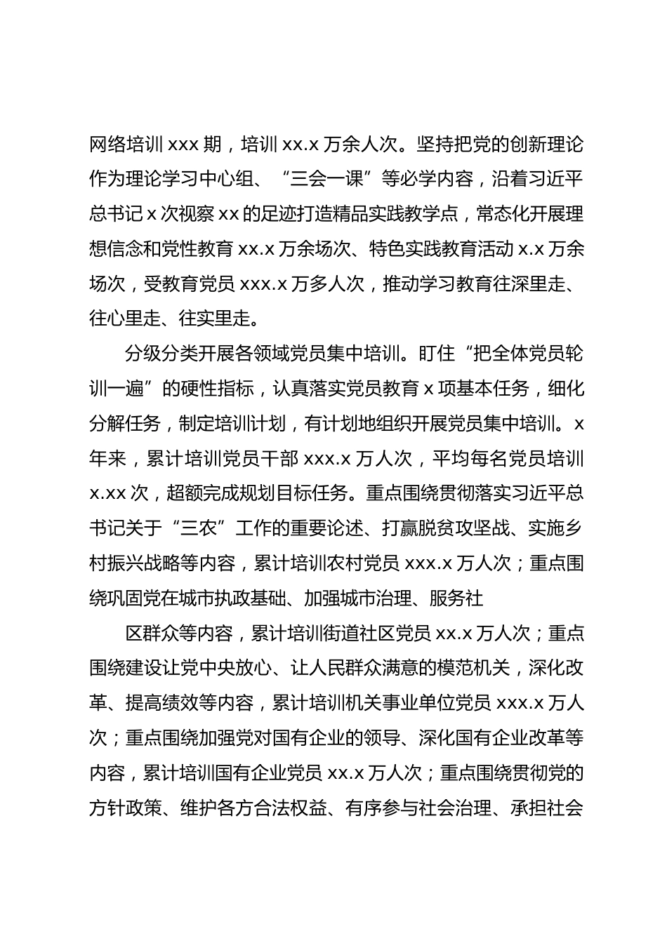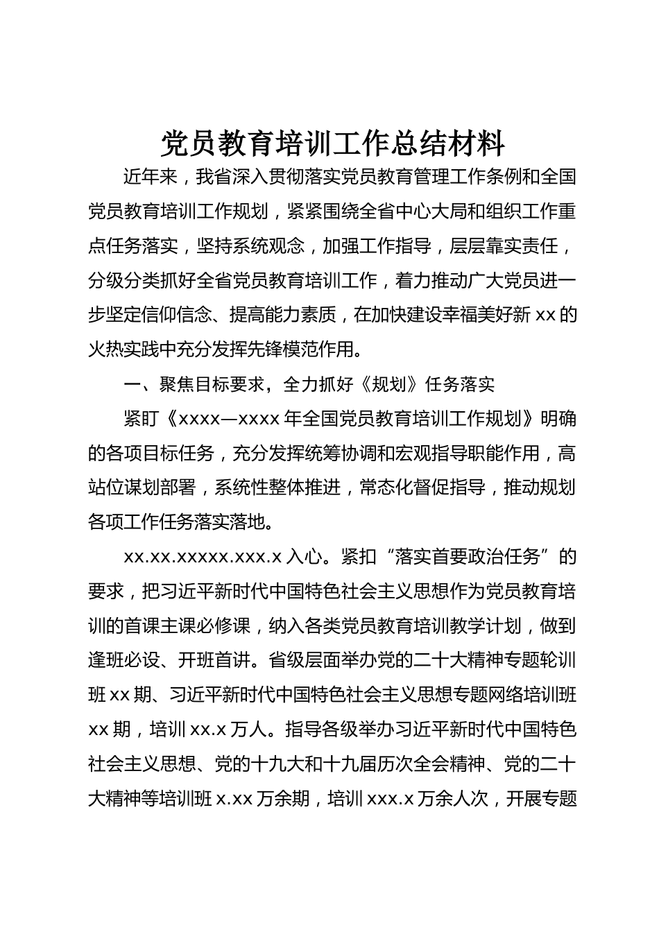 黨員教育培訓(xùn)工作總結(jié)材料近年來,我省深入貫徹落實黨員教育管理工作條例和全國黨員教育培訓(xùn)工作規(guī)劃,緊緊圍繞全省中心大局和組織工作重點任務(wù)落實,堅持系統(tǒng)觀念,加強工作指導(dǎo),層層靠實責(zé)任,分級分類抓好全省黨員教育培訓(xùn)工作,著力推動廣大黨員進一步堅定信仰信念、提高能力素質(zhì),在加快建設(shè)幸福美好新xx的火熱實踐中充分發(fā)揮先鋒模范作用。一、聚焦目標(biāo)要求,全力抓好《規(guī)劃》任務(wù)落實緊盯《xxxx—xxxx年全國黨員教育培訓(xùn)工作規(guī)劃》明確的各項目標(biāo)任務(wù),充分發(fā)揮統(tǒng)籌協(xié)調(diào)和宏觀指導(dǎo)職能作用,高站位謀劃部署,系統(tǒng)性整體推進,常態(tài)化督促指導(dǎo),推動規(guī)劃各項工作任...