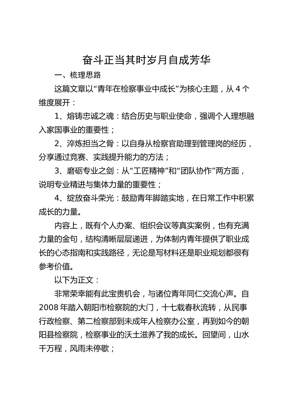 奮斗正當(dāng)其時歲月自成芳華一、梳理思路“”這篇文章以青年在檢察事業(yè)中成長為核心主題,從4個維度展開:1、熔鑄忠誠之魂:結(jié)合歷史與職業(yè)使命,強(qiáng)調(diào)個人理想融入家國事業(yè)的重要性;2、淬煉擔(dān)當(dāng)之骨:以自身從檢察官助理到管理崗的經(jīng)歷,分享通過競賽、實(shí)踐提升能力的方法;3“”“”、磨礪專業(yè)之劍:從工匠精神和團(tuán)隊(duì)協(xié)作兩方面,說明專業(yè)精進(jìn)與集體力量的重要性;4、綻放奮斗榮光:鼓勵青年腳踏實(shí)地,在日常工作中積累成長的力量。內(nèi)容上,既有個人辦案、組織會議等真實(shí)案例,也有充滿力量的金句,結(jié)構(gòu)清晰層層遞進(jìn),為體制內(nèi)青年提供了職業(yè)成長的心態(tài)指南和實(shí)踐路徑,...