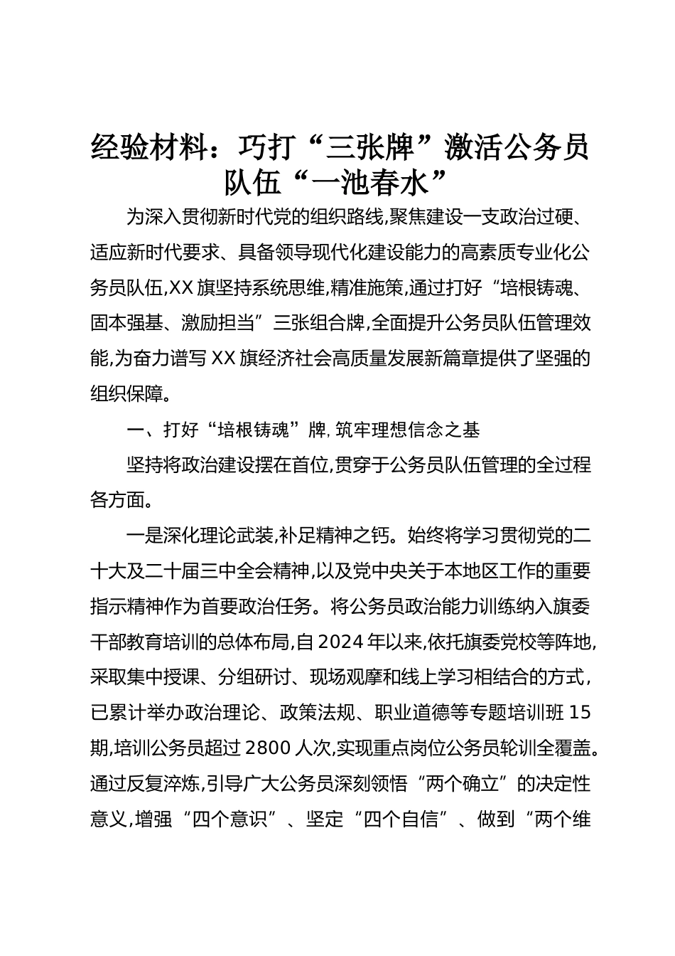 經(jīng)驗(yàn)材料:巧打“三張牌”激活公務(wù)員隊(duì)伍“一池春水”為深入貫徹新時(shí)代黨的組織路線,聚焦建設(shè)一支政治過硬、適應(yīng)新時(shí)代要求、具備領(lǐng)導(dǎo)現(xiàn)代化建設(shè)能力的高素質(zhì)專業(yè)化公務(wù)員隊(duì)伍,XX旗堅(jiān)持系統(tǒng)思維,精準(zhǔn)施策,通過打好“培根鑄魂、固本強(qiáng)基、激勵(lì)擔(dān)當(dāng)”三張組合牌,全面提升公務(wù)員隊(duì)伍管理效能,為奮力譜寫XX旗經(jīng)濟(jì)社會(huì)高質(zhì)量發(fā)展新篇章提供了堅(jiān)強(qiáng)的組織保障。一、打好“培根鑄魂”牌,筑牢理想信念之基堅(jiān)持將政治建設(shè)擺在首位,貫穿于公務(wù)員隊(duì)伍管理的全過程各方面。一是深化理論武裝,補(bǔ)足精神之鈣。始終將學(xué)習(xí)貫徹黨的二十大及二十屆三中全會(huì)精神,以及黨中央關(guān)于本地區(qū)工作的重...