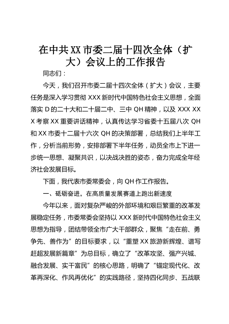 在中共XX市委二屆十四次全體(擴(kuò)大)會議上的工作報告同志們:今天,我們召開市委二屆十四次全體(擴(kuò)大)會議,主要任務(wù)是深入學(xué)習(xí)貫徹XXX新時代中國特色社會主義思想,全面落實D的二十大和二十屆二中、三中QH精神,以及XXXXXX考察XX重要講話精神,認(rèn)真?zhèn)鬟_(dá)學(xué)習(xí)省委十五屆八次QH和XX市委十二屆十六次QH的決策部署,總結(jié)我們上半年工作,分析當(dāng)前形勢,安排部署下半年任務(wù),動員全市上下進(jìn)一步統(tǒng)一思想、凝聚共識,以決戰(zhàn)決勝的姿態(tài),奮力完成全年經(jīng)濟(jì)社會發(fā)展目標(biāo)。下面,我代表市委常委會,向QH作工作報告。一、砥礪奮進(jìn),在高質(zhì)量發(fā)展賽道上跑出新速度今年以來,面對復(fù)...