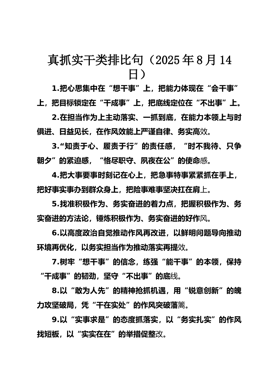真抓實干類排比句(2025年8月14日)1.把心思集中在“想干事”上,把能力體現(xiàn)在“會干事”上,把目標鎖定在“干成事”上,把底線定位在“不出事”上。2.在擔當作為上主動落實、一抓到底,在能力本領(lǐng)上與時俱進、日益見長,在作風效能上嚴謹自律、務(wù)實高效。3.“知責于心、履責于行”的責任感,“時不我待、只爭朝夕”的緊迫感,“恪盡職守、夙夜在公”的使命感。4.把大事要事時刻記在心上,把急事特事緊緊抓在手上,把好事實事辦到群眾身上,把險事難事堅決扛在肩上。5.找準積極作為、務(wù)實奮進的著力點,把握積極作為、務(wù)實奮進的方法論,錘煉積極作為、務(wù)實奮進的好作風...
