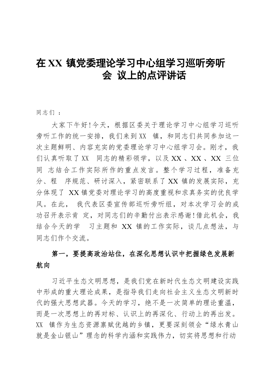 在XX鎮(zhèn)黨委理論學習中心組學習巡聽旁聽會議上的點評講話同志們:大家下午好!今天,根據(jù)區(qū)委關于理論學習中心組學習巡聽旁聽工作的統(tǒng)一安排,我們來到XX鎮(zhèn),和同志們共同參加這一次主題鮮明、內容充實的黨委理論學習中心組學習會。剛才,我們認真聽取了XX同志的精彩領學,以及XX、XX、XX三位同志結合工作實際所作的重點發(fā)言。整個學習過程,準備充分、程序規(guī)范、研討深入,緊密聯(lián)系了XX鎮(zhèn)的發(fā)展實際,充分體現(xiàn)了XX鎮(zhèn)黨委對理論學習的高度重視和求真務實的優(yōu)良學風。在此,我代表區(qū)委宣傳部巡聽旁聽組,對本次學習會的成功召開表示肯定,對同志們的辛勤付出表示感謝!借此機...