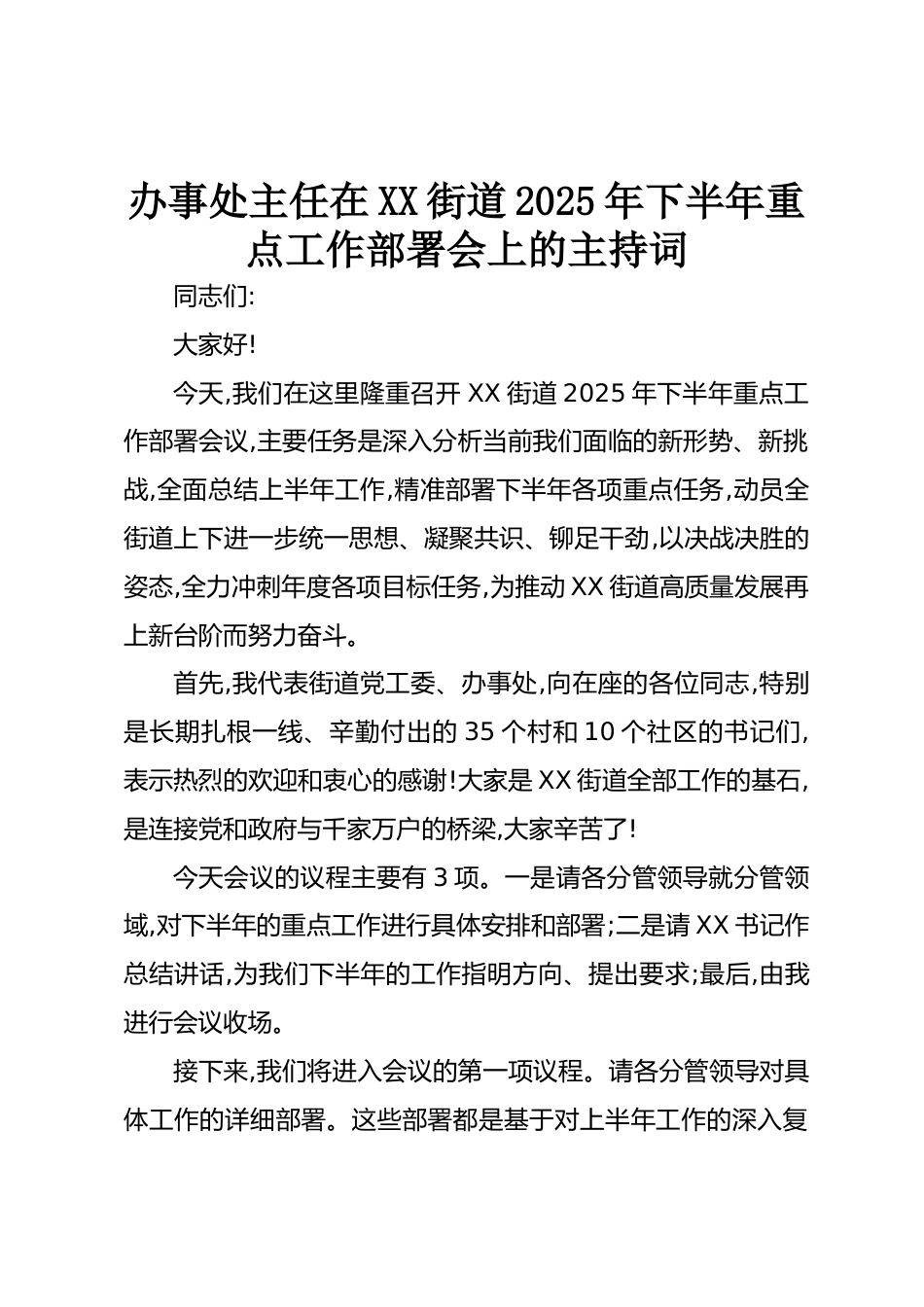 辦事處主任在XX街道2025年下半年重點工作部署會上的主持詞VIP免費