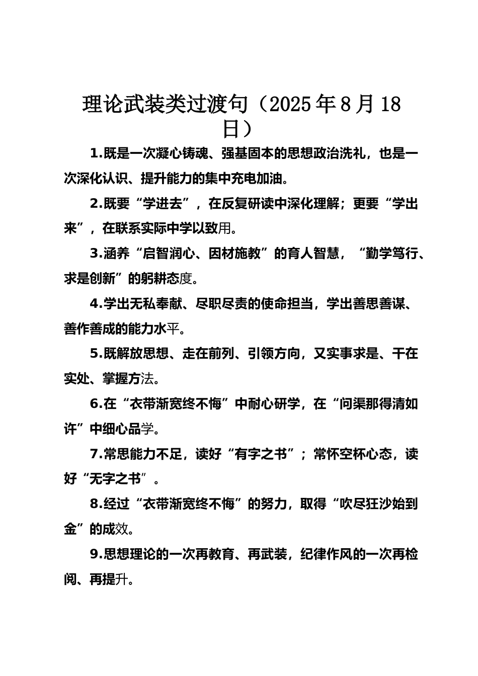理論武裝類過渡句(2025年8月18日)1.既是一次凝心鑄魂、強(qiáng)基固本的思想政治洗禮,也是一次深化認(rèn)識(shí)、提升能力的集中充電加油。2.既要“學(xué)進(jìn)去”,在反復(fù)研讀中深化理解;更要“學(xué)出來”,在聯(lián)系實(shí)際中學(xué)以致用。3.涵養(yǎng)“啟智潤(rùn)心、因材施教”的育人智慧,“勤學(xué)篤行、求是創(chuàng)新”的躬耕態(tài)度。4.學(xué)出無私奉獻(xiàn)、盡職盡責(zé)的使命擔(dān)當(dāng),學(xué)出善思善謀、善作善成的能力水平。5.既解放思想、走在前列、引領(lǐng)方向,又實(shí)事求是、干在實(shí)處、掌握方法。6.在“衣帶漸寬終不悔”中耐心研學(xué),在“問渠那得清如許”中細(xì)心品學(xué)。7.常思能力不足,讀好“有字之書”;常懷空杯心態(tài),讀好“無...
