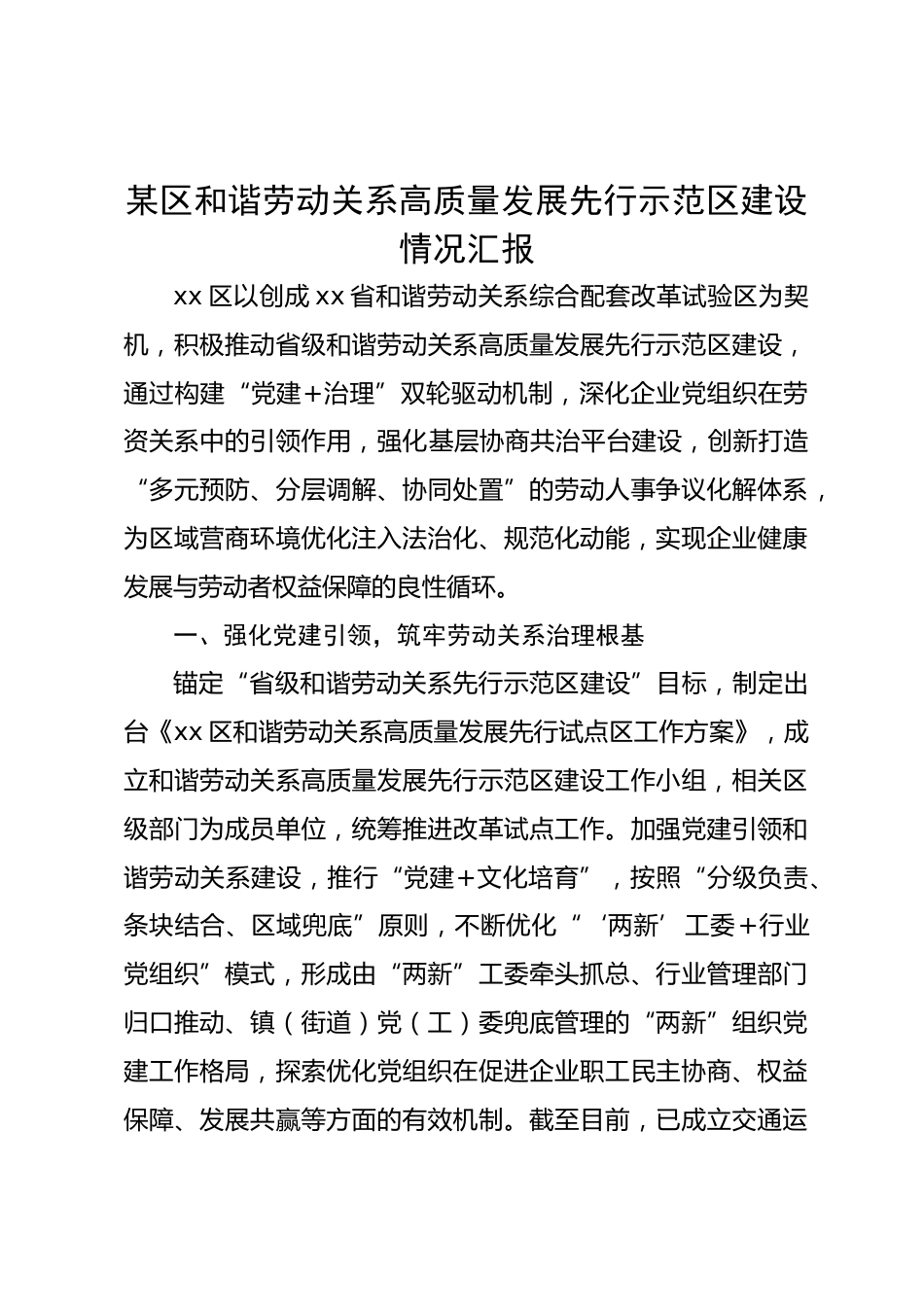 某區(qū)和諧勞動關(guān)系高質(zhì)量發(fā)展先行示范區(qū)建設(shè)情況匯報xx區(qū)以創(chuàng)成xx省和諧勞動關(guān)系綜合配套改革試驗區(qū)為契機,積極推動省級和諧勞動關(guān)系高質(zhì)量發(fā)展先行示范區(qū)建設(shè),通過構(gòu)建“黨建+治理”雙輪驅(qū)動機制,深化企業(yè)黨組織在勞資關(guān)系中的引領(lǐng)作用,強化基層協(xié)商共治平臺建設(shè),創(chuàng)新打造“多元預(yù)防、分層調(diào)解、協(xié)同處置”的勞動人事爭議化解體系,為區(qū)域營商環(huán)境優(yōu)化注入法治化、規(guī)范化動能,實現(xiàn)企業(yè)健康發(fā)展與勞動者權(quán)益保障的良性循環(huán)。一、強化黨建引領(lǐng),筑牢勞動關(guān)系治理根基錨定“省級和諧勞動關(guān)系先行示范區(qū)建設(shè)”目標(biāo),制定出臺《xx區(qū)和諧勞動關(guān)系高質(zhì)量發(fā)展先行試點區(qū)工...
