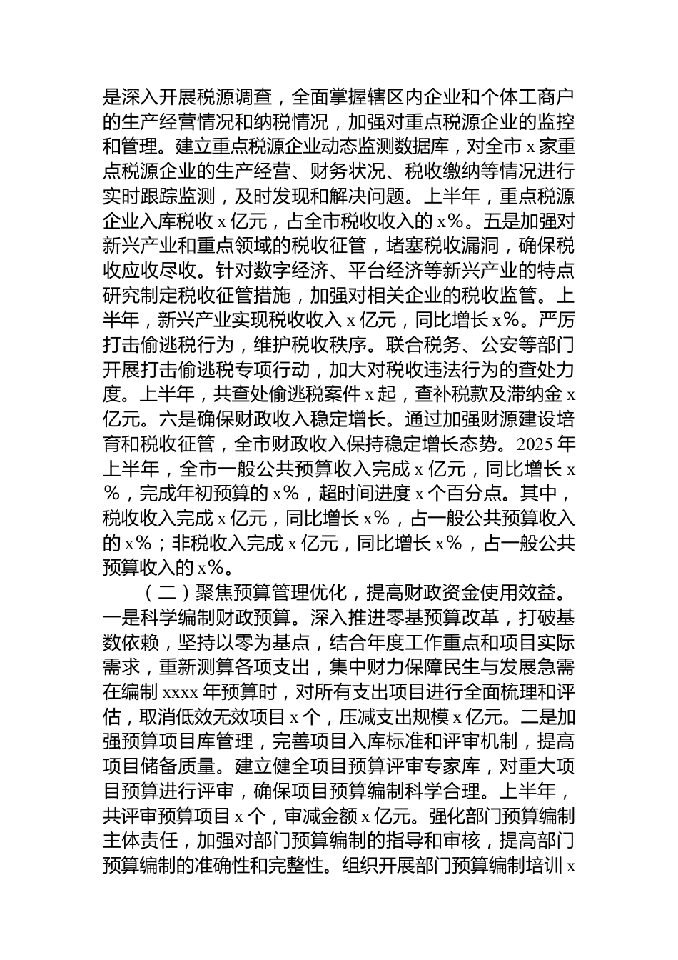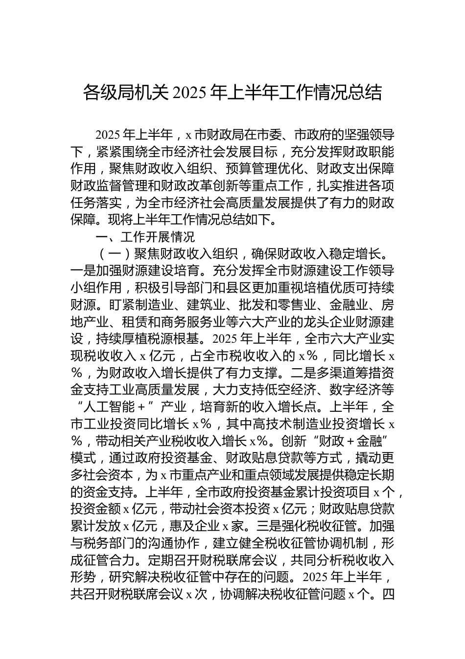 財政局2025年上半年工作情況總結(jié)匯編(6篇)目錄1.各級局機關(guān)2025年上半年工作情況總結(jié)...............................22.司法局2025年上半年工作總結(jié)...........................................123.住建局2025年上半年工作總結(jié)...........................................244.民政局2025年上半年工作總結(jié)...........................................325.交通運輸局2025年上半年工作總結(jié)...................................436.工業(yè)園區(qū)2025年上半年作風建設(shè)工作情況總結(jié)...............53各級局機關(guān)2025年上半年工作情況總結(jié)2025年上半年,x市財政局在市委、市政...