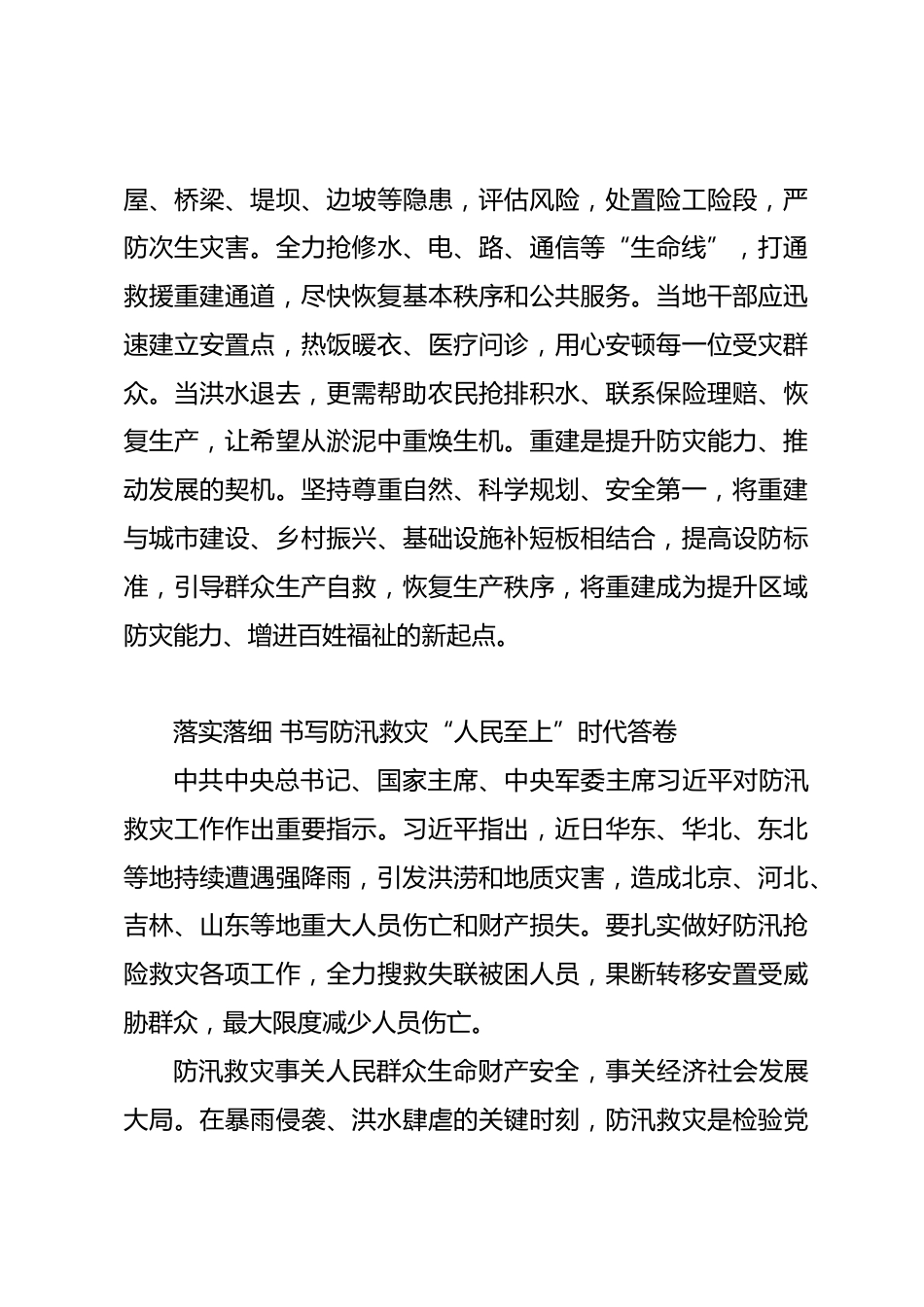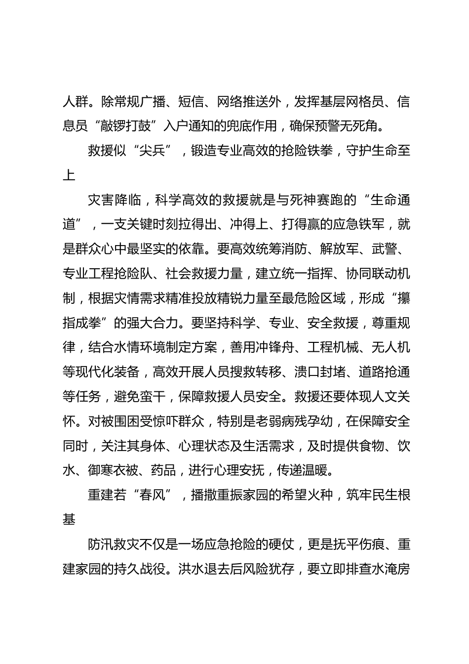 (14篇)防汛抗災(zāi)文稿匯編預(yù)警、救援、重建構(gòu)筑防汛救災(zāi)生命防線當(dāng)前正值“七下八上”防汛關(guān)鍵期,華北、東北等地汛情嚴(yán)峻,洪澇和地質(zhì)災(zāi)害威脅人民群眾生命財(cái)產(chǎn)安全。面對嚴(yán)峻挑戰(zhàn),廣大黨員干部要聞“汛”而動(dòng),將防汛救災(zāi)作為頭等大事,全力構(gòu)筑預(yù)警有效、救援有力、重建有序的“生命防線”,堅(jiān)決打贏防汛硬仗。預(yù)警如“雷達(dá)”,織密全域覆蓋的感知天網(wǎng),搶占防御先機(jī)防汛救災(zāi),“防”是生命線。精準(zhǔn)預(yù)警是贏得主動(dòng)、防御災(zāi)害的關(guān)鍵。綜合運(yùn)用衛(wèi)星、雷達(dá)、智能網(wǎng)格預(yù)報(bào)等手段,動(dòng)態(tài)監(jiān)測雨情、水情、汛情、工情。推動(dòng)氣象、水文、應(yīng)急等部門數(shù)據(jù)融合共享,運(yùn)用大數(shù)據(jù)、AI...