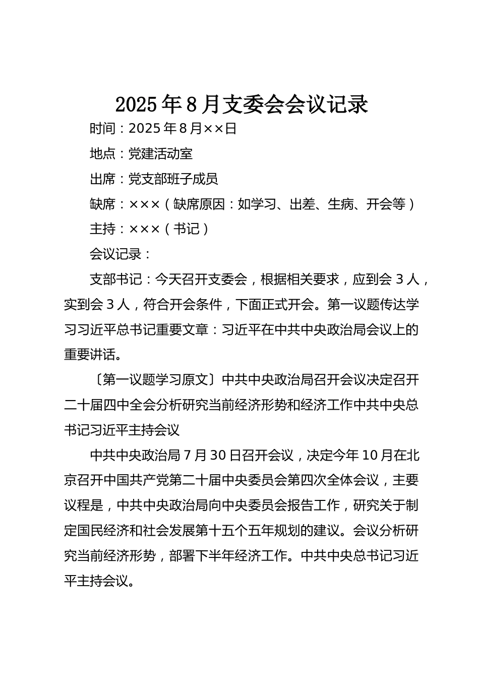 2025年8月支委會(huì)會(huì)議記錄時(shí)間:2025年8月××日地點(diǎn):黨建活動(dòng)室出席:黨支部班子成員缺席:×××(缺席原因:如學(xué)習(xí)、出差、生病、開會(huì)等)主持:×××(書記)會(huì)議記錄:支部書記:今天召開支委會(huì),根據(jù)相關(guān)要求,應(yīng)到會(huì)3人,實(shí)到會(huì)3人,符合開會(huì)條件,下面正式開會(huì)。第一議題傳達(dá)學(xué)習(xí)習(xí)近平總書記重要文章:習(xí)近平在中共中央政治局會(huì)議上的重要講話?!驳谝蛔h題學(xué)習(xí)原文〕中共中央政治局召開會(huì)議決定召開二十屆四中全會(huì)分析研究當(dāng)前經(jīng)濟(jì)形勢(shì)和經(jīng)濟(jì)工作中共中央總書記習(xí)近平主持會(huì)議中共中央政治局7月30日召開會(huì)議,決定今年10月在北京召開中國(guó)共產(chǎn)黨第二十屆中央委...