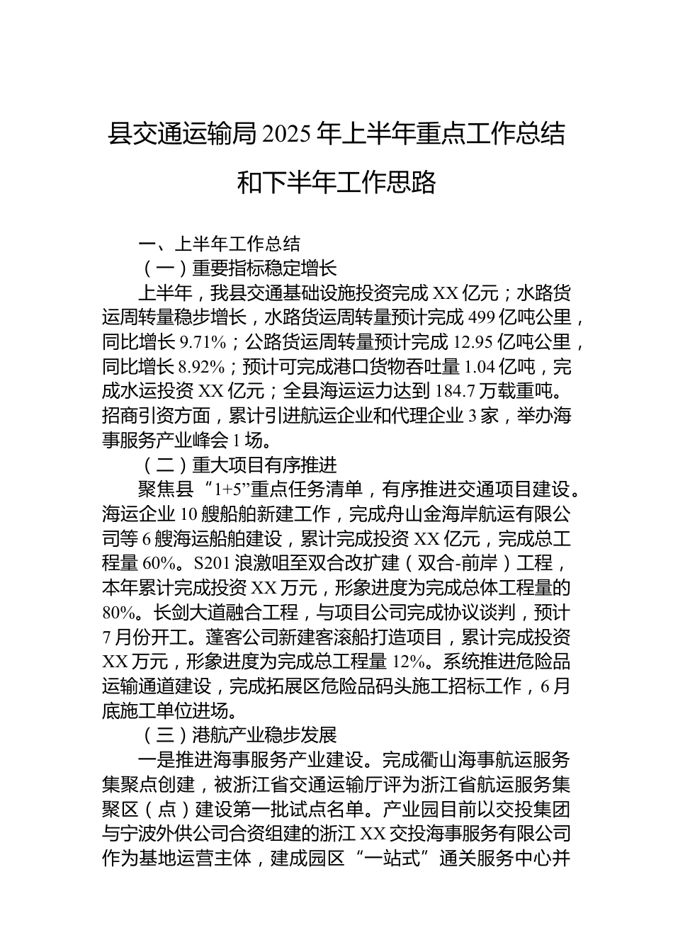 縣交通運(yùn)輸局2025年上半年重點(diǎn)工作總結(jié)和下半年工作思路一、上半年工作總結(jié)(一)重要指標(biāo)穩(wěn)定增長(zhǎng)上半年,我縣交通基礎(chǔ)設(shè)施投資完成XX億元;水路貨運(yùn)周轉(zhuǎn)量穩(wěn)步增長(zhǎng),水路貨運(yùn)周轉(zhuǎn)量預(yù)計(jì)完成499億噸公里,同比增長(zhǎng)9.71%;公路貨運(yùn)周轉(zhuǎn)量預(yù)計(jì)完成12.95億噸公里,同比增長(zhǎng)8.92%;預(yù)計(jì)可完成港口貨物吞吐量1.04億噸,完成水運(yùn)投資XX億元;全縣海運(yùn)運(yùn)力達(dá)到184.7萬(wàn)載重噸。招商引資方面,累計(jì)引進(jìn)航運(yùn)企業(yè)和代理企業(yè)3家,舉辦海事服務(wù)產(chǎn)業(yè)峰會(huì)1場(chǎng)。(二)重大項(xiàng)目有序推進(jìn)聚焦縣“1+5”重點(diǎn)任務(wù)清單,有序推進(jìn)交通項(xiàng)目建設(shè)。海運(yùn)企業(yè)10艘船舶新建工作,完成舟山金海岸航運(yùn)有...