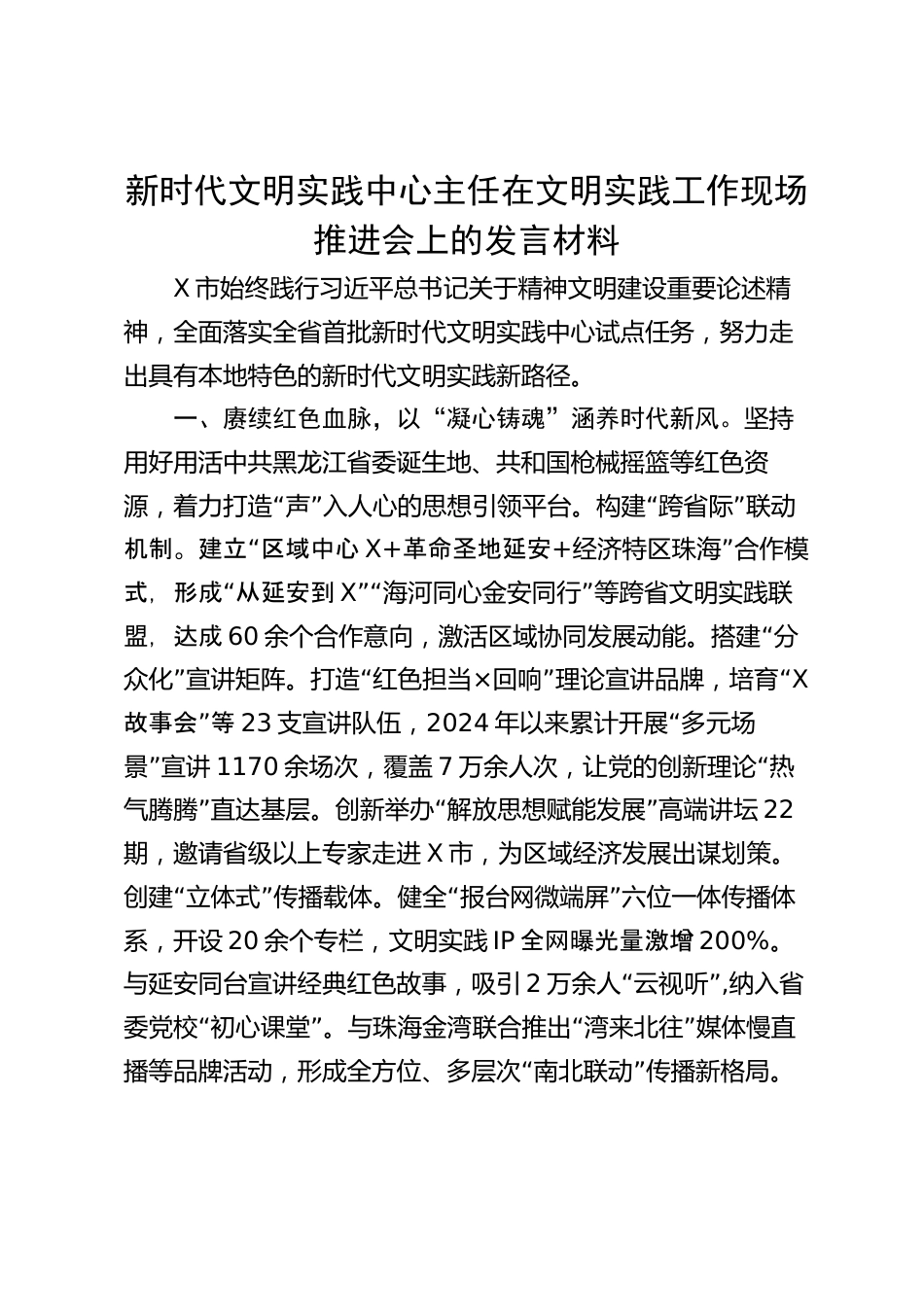 新時代文明實踐中心主任在文明實踐工作現(xiàn)場推進(jìn)會上的發(fā)言材料X市始終踐行習(xí)近平總書記關(guān)于精神文明建設(shè)重要論述精神,全面落實全省首批新時代文明實踐中心試點任務(wù),努力走出具有本地特色的新時代文明實踐新路徑。一、賡續(xù)紅色血脈,以“凝心鑄魂”涵養(yǎng)時代新風(fēng)。堅持用好用活中共黑龍江省委誕生地、共和國槍械搖籃等紅色資“”“”源,著力打造聲入人心的思想引領(lǐng)平臺。構(gòu)建跨省際聯(lián)動“機(jī)制。建立區(qū)域中心X+革命圣地延安+”經(jīng)濟(jì)特區(qū)珠海合作?!笆剑纬蓮难影驳絏”“”海河同心金安同行等跨省文明實踐聯(lián)盟,達(dá)成60“余個合作意向,激活區(qū)域協(xié)同發(fā)展動能。搭建分”“...