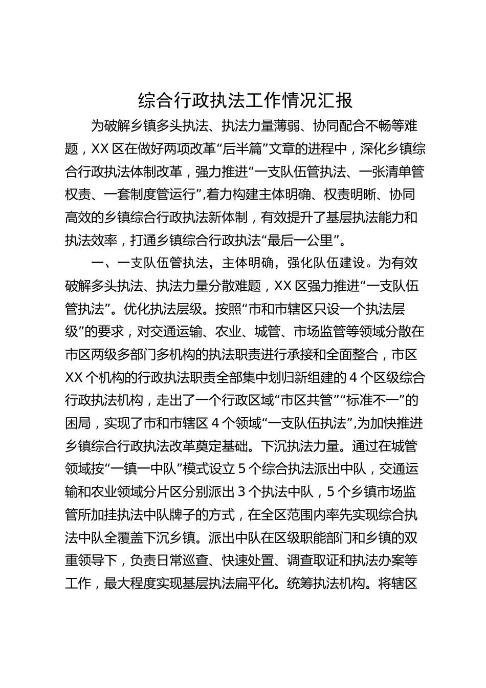 綜合行政執(zhí)法工作情況匯報為破解鄉(xiāng)鎮(zhèn)多頭執(zhí)法、執(zhí)法力量薄弱、協(xié)同配合不暢等難題,XX“”區(qū)在做好兩項改革后半篇文章的進程中,深化鄉(xiāng)鎮(zhèn)綜“合行政執(zhí)法體制改革,強力推進一支隊伍管執(zhí)法、一張清單管”權(quán)責、一套制度管運行,著力構(gòu)建主體明確、權(quán)責明晰、協(xié)同高效的鄉(xiāng)鎮(zhèn)綜合行政執(zhí)法新體制,有效提升了基層執(zhí)法能力和“”執(zhí)法效率,打通鄉(xiāng)鎮(zhèn)綜合行政執(zhí)法最后一公里。一、一支隊伍管執(zhí)法,主體明確,強化隊伍建設(shè)。為有效破解多頭執(zhí)法、執(zhí)法力量分散難題,XX“區(qū)強力推進一支隊伍”“管執(zhí)法。優(yōu)化執(zhí)法層級。按照市和市轄區(qū)只設(shè)一個執(zhí)法層”級的要求,對交通運輸、農(nóng)業(yè)、...