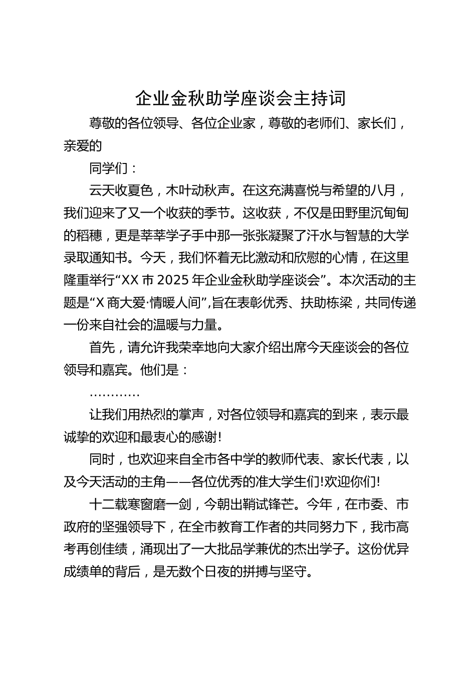 企業(yè)金秋助學(xué)座談會(huì)主持詞尊敬的各位領(lǐng)導(dǎo)、各位企業(yè)家,尊敬的老師們、家長(zhǎng)們,親愛(ài)的同學(xué)們:云天收夏色,木葉動(dòng)秋聲。在這充滿喜悅與希望的八月,我們迎來(lái)了又一個(gè)收獲的季節(jié)。這收獲,不僅是田野里沉甸甸的稻穗,更是莘莘學(xué)子手中那一張張凝聚了汗水與智慧的大學(xué)錄取通知書(shū)。今天,我們懷著無(wú)比激動(dòng)和欣慰的心情,在這里“隆重舉行XX市2025”年企業(yè)金秋助學(xué)座談會(huì)。本次活動(dòng)的主“題是X商大愛(ài)·”情暖人間,旨在表彰優(yōu)秀、扶助棟梁,共同傳遞一份來(lái)自社會(huì)的溫暖與力量。首先,請(qǐng)?jiān)试S我榮幸地向大家介紹出席今天座談會(huì)的各位領(lǐng)導(dǎo)和嘉賓。他們是:…………讓我們用熱烈的...