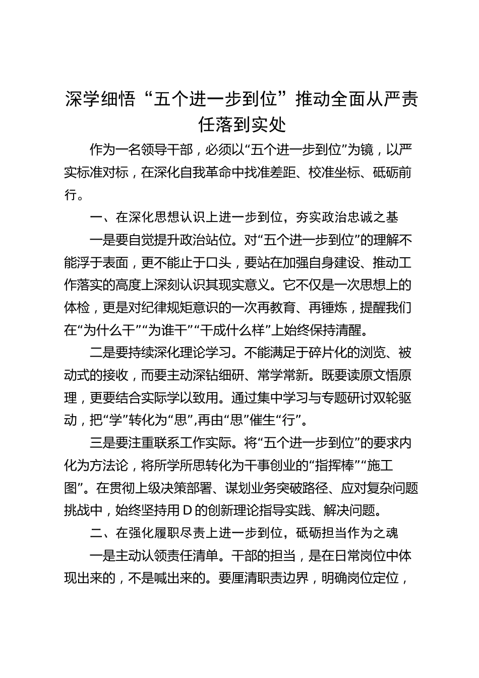 深學(xué)細(xì)悟“五個(gè)進(jìn)一步到位”推動(dòng)全面從嚴(yán)責(zé)任落到實(shí)處作為一名領(lǐng)導(dǎo)干部“”,必須以五個(gè)進(jìn)一步到位為鏡,以嚴(yán)實(shí)標(biāo)準(zhǔn)對(duì)標(biāo),在深化自我革命中找準(zhǔn)差距、校準(zhǔn)坐標(biāo)、砥礪前行。一、在深化思想認(rèn)識(shí)上進(jìn)一步到位,夯實(shí)政治忠誠(chéng)之基“”一是要自覺(jué)提升政治站位。對(duì)五個(gè)進(jìn)一步到位的理解不能浮于表面,更不能止于口頭,要站在加強(qiáng)自身建設(shè)、推動(dòng)工作落實(shí)的高度上深刻認(rèn)識(shí)其現(xiàn)實(shí)意義。它不僅是一次思想上的體檢,更是對(duì)紀(jì)律規(guī)矩意識(shí)的一次再教育、再錘煉,提醒我們“”“”“”在為什么干為誰(shuí)干干成什么樣上始終保持清醒。二是要持續(xù)深化理論學(xué)習(xí)。不能滿足于碎片化的瀏覽、被動(dòng)式...