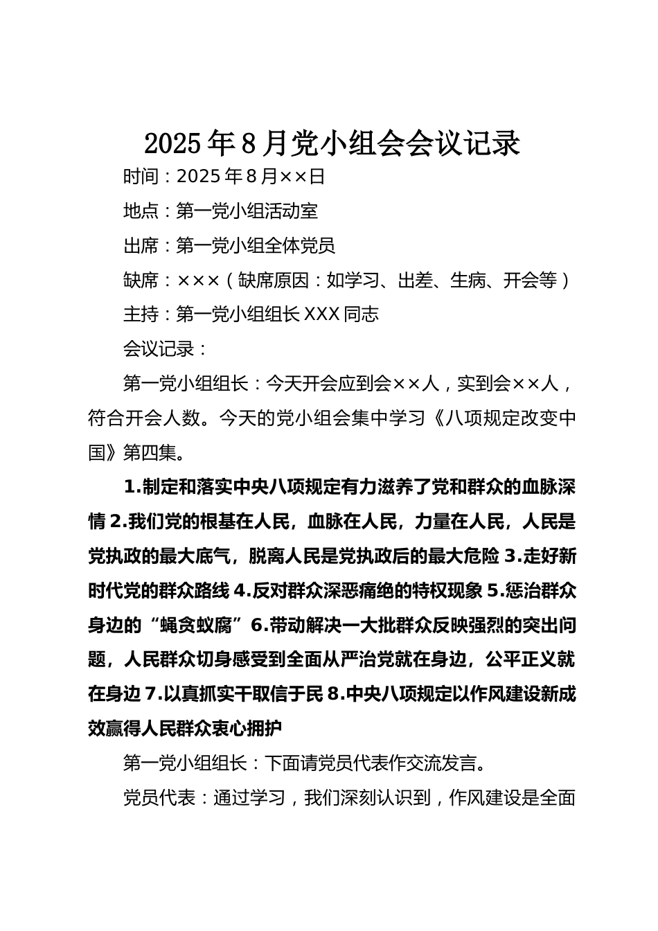2025年8月黨小組會會議記錄時間:2025年8月××日地點:第一黨小組活動室出席:第一黨小組全體黨員缺席:×××(缺席原因:如學習、出差、生病、開會等)主持:第一黨小組組長XXX同志會議記錄:第一黨小組組長:今天開會應到會××人,實到會××人,符合開會人數(shù)。今天的黨小組會集中學習《八項規(guī)定改變中國》第四集。1.制定和落實中央八項規(guī)定有力滋養(yǎng)了黨和群眾的血脈深情2.我們黨的根基在人民,血脈在人民,力量在人民,人民是黨執(zhí)政的最大底氣,脫離人民是黨執(zhí)政后的最大危險3.走好新時代黨的群眾路線4.反對群眾深惡痛絕的特權現(xiàn)象5.懲治群眾身邊的“蠅貪蟻腐”6....