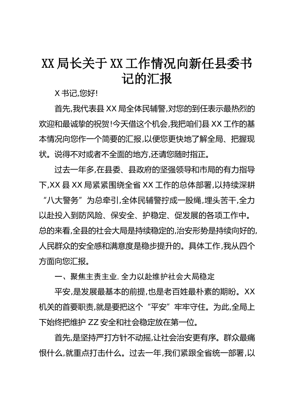 XX局長(zhǎng)關(guān)于XX工作情況向新任縣委書(shū)記的匯報(bào)X書(shū)記,您好!首先,我代表縣XX局全體民輔警,對(duì)您的到任表示最熱烈的歡迎和最誠(chéng)摯的祝賀!今天借這個(gè)機(jī)會(huì),我把咱們縣XX工作的基本情況向您作一個(gè)簡(jiǎn)要的匯報(bào),以便您更快地了解全局、把握現(xiàn)狀。說(shuō)得不對(duì)或者不全面的地方,還請(qǐng)您隨時(shí)指正。過(guò)去一年多,在縣委、縣政府的堅(jiān)強(qiáng)領(lǐng)導(dǎo)和市局的有力指導(dǎo)下,XX縣XX局緊緊圍繞全省XX工作的總體部署,以持續(xù)深耕“八大警務(wù)”為總牽引,全體民輔警擰成一股繩,埋頭苦干,全力以赴投入到防風(fēng)險(xiǎn)、保安全、護(hù)穩(wěn)定、促發(fā)展的各項(xiàng)工作中??偟膩?lái)看,全縣的社會(huì)大局是持續(xù)穩(wěn)定的,治安形勢(shì)是持續(xù)向好的,人民群眾...
