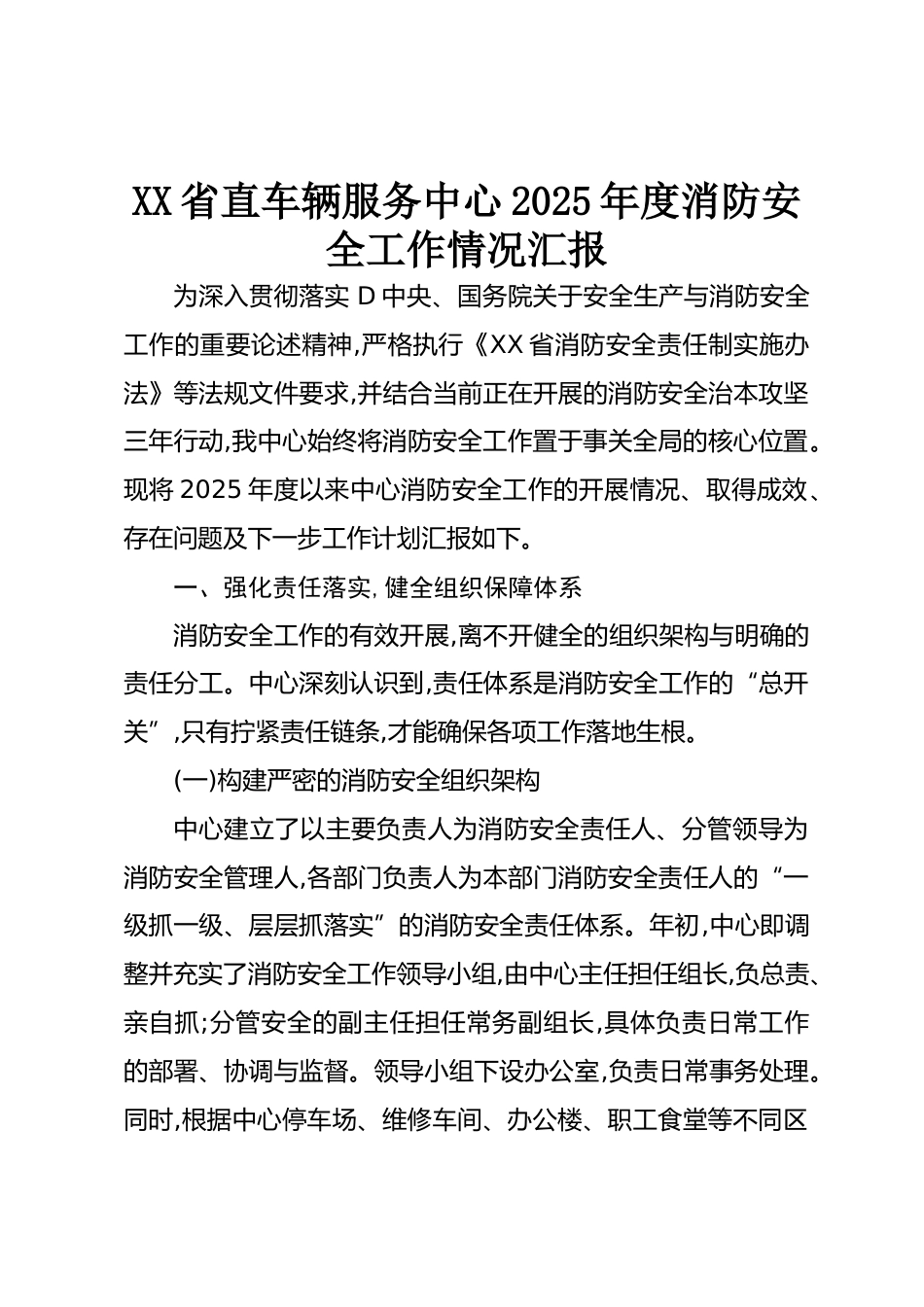 XX省直車(chē)輛服務(wù)中心2025年度消防安全工作情況匯報(bào)為深入貫徹落實(shí)D中央、國(guó)務(wù)院關(guān)于安全生產(chǎn)與消防安全工作的重要論述精神,嚴(yán)格執(zhí)行《XX省消防安全責(zé)任制實(shí)施辦法》等法規(guī)文件要求,并結(jié)合當(dāng)前正在開(kāi)展的消防安全治本攻堅(jiān)三年行動(dòng),我中心始終將消防安全工作置于事關(guān)全局的核心位置?,F(xiàn)將2025年度以來(lái)中心消防安全工作的開(kāi)展情況、取得成效、存在問(wèn)題及下一步工作計(jì)劃匯報(bào)如下。一、強(qiáng)化責(zé)任落實(shí),健全組織保障體系消防安全工作的有效開(kāi)展,離不開(kāi)健全的組織架構(gòu)與明確的責(zé)任分工。中心深刻認(rèn)識(shí)到,責(zé)任體系是消防安全工作的“總開(kāi)關(guān)”,只有擰緊責(zé)任鏈條,才能確保各項(xiàng)工作落地...