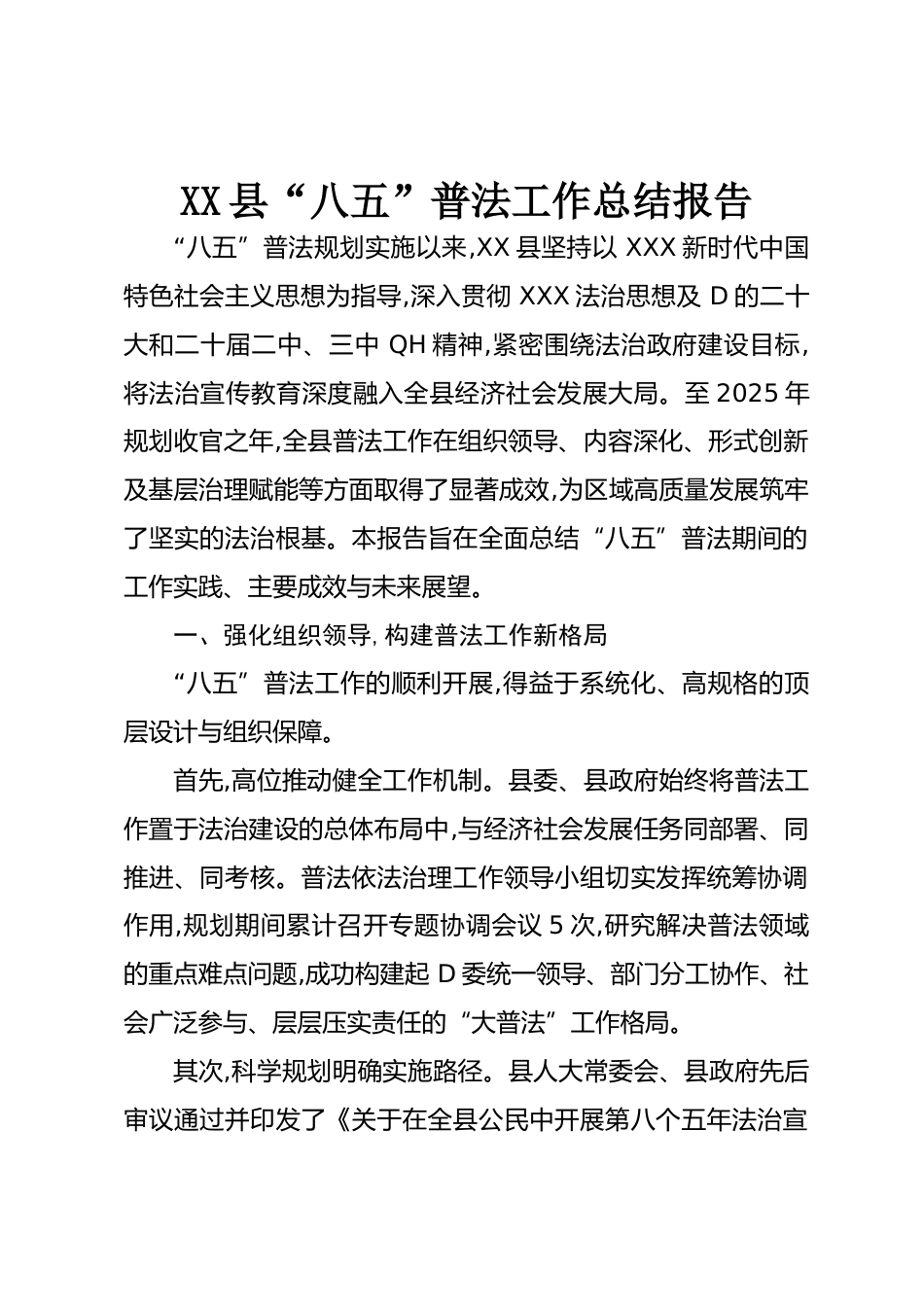 XX縣“八五”普法工作總結(jié)報告“八五”普法規(guī)劃實施以來,XX縣堅持以XXX新時代中國特色社會主義思想為指導(dǎo),深入貫徹XXX法治思想及D的二十大和二十屆二中、三中QH精神,緊密圍繞法治政府建設(shè)目標,將法治宣傳教育深度融入全縣經(jīng)濟社會發(fā)展大局。至2025年規(guī)劃收官之年,全縣普法工作在組織領(lǐng)導(dǎo)、內(nèi)容深化、形式創(chuàng)新及基層治理賦能等方面取得了顯著成效,為區(qū)域高質(zhì)量發(fā)展筑牢了堅實的法治根基。本報告旨在全面總結(jié)“八五”普法期間的工作實踐、主要成效與未來展望。一、強化組織領(lǐng)導(dǎo),構(gòu)建普法工作新格局“八五”普法工作的順利開展,得益于系統(tǒng)化、高規(guī)格的頂層設(shè)計與組織保障。...