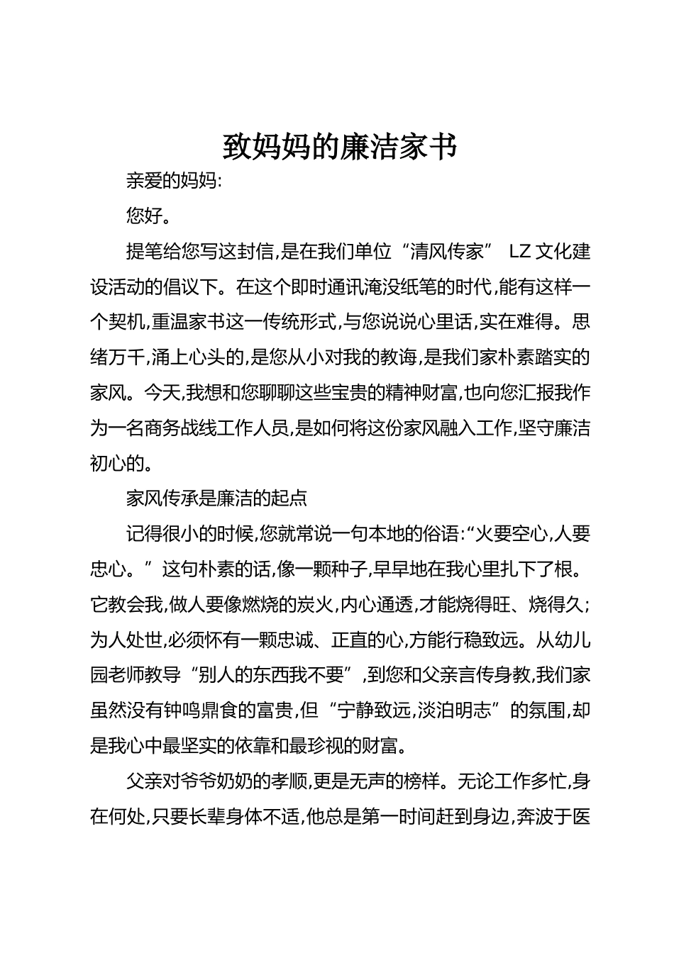 致媽媽的廉潔家書親愛的媽媽:您好。提筆給您寫這封信,是在我們單位“清風傳家”LZ文化建設活動的倡議下。在這個即時通訊淹沒紙筆的時代,能有這樣一個契機,重溫家書這一傳統(tǒng)形式,與您說說心里話,實在難得。思緒萬千,涌上心頭的,是您從小對我的教誨,是我們家樸素踏實的家風。今天,我想和您聊聊這些寶貴的精神財富,也向您匯報我作為一名商務戰(zhàn)線工作人員,是如何將這份家風融入工作,堅守廉潔初心的。家風傳承是廉潔的起點記得很小的時候,您就常說一句本地的俗語:“火要空心,人要忠心?!边@句樸素的話,像一顆種子,早早地在我心里扎下了根。它教會我,做人要像燃燒的炭火,內心通...