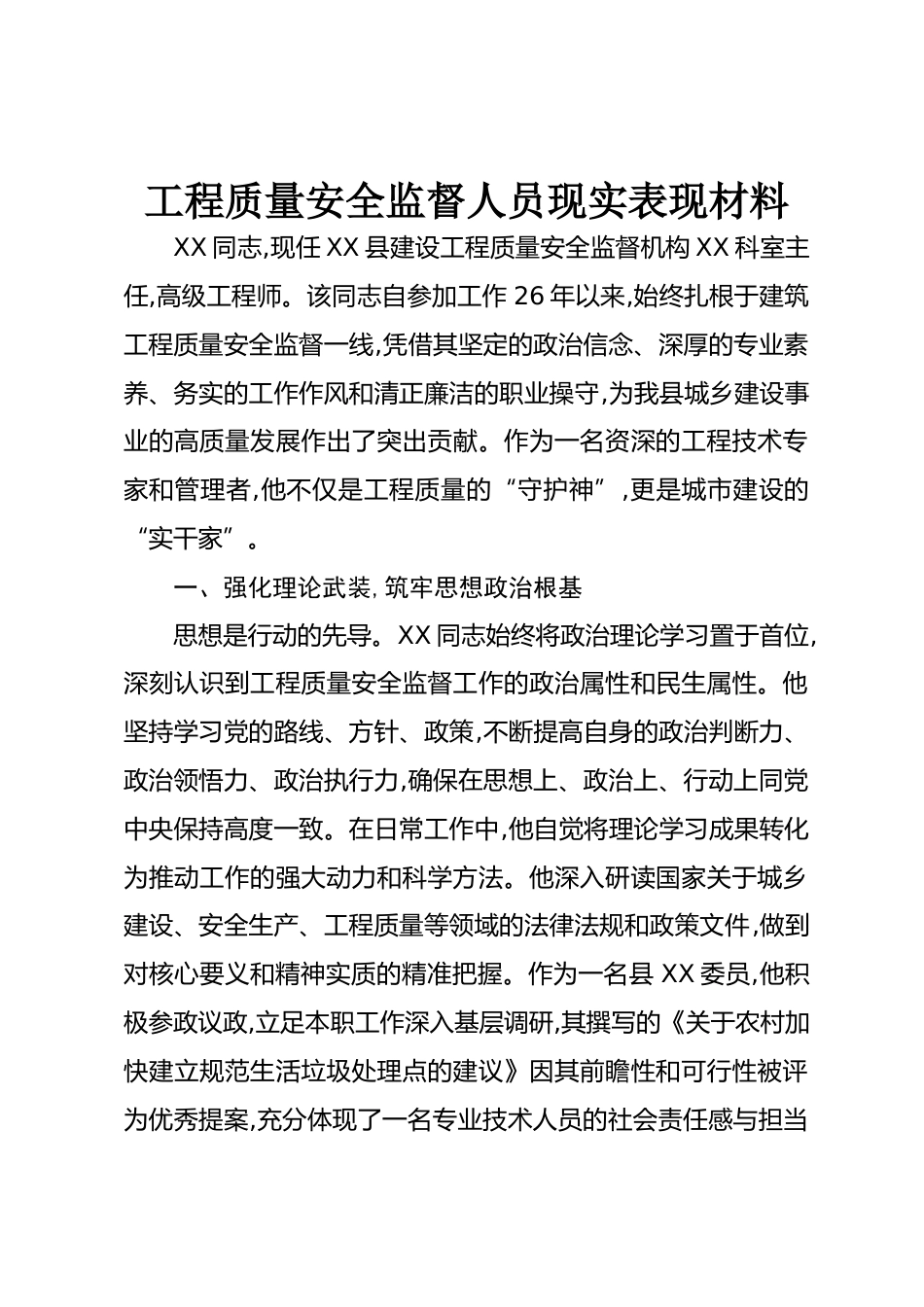 工程質(zhì)量安全監(jiān)督人員現(xiàn)實(shí)表現(xiàn)材料XX同志,現(xiàn)任XX縣建設(shè)工程質(zhì)量安全監(jiān)督機(jī)構(gòu)XX科室主任,高級(jí)工程師。該同志自參加工作26年以來,始終扎根于建筑工程質(zhì)量安全監(jiān)督一線,憑借其堅(jiān)定的政治信念、深厚的專業(yè)素養(yǎng)、務(wù)實(shí)的工作作風(fēng)和清正廉潔的職業(yè)操守,為我縣城鄉(xiāng)建設(shè)事業(yè)的高質(zhì)量發(fā)展作出了突出貢獻(xiàn)。作為一名資深的工程技術(shù)專家和管理者,他不僅是工程質(zhì)量的“守護(hù)神”,更是城市建設(shè)的“實(shí)干家”。一、強(qiáng)化理論武裝,筑牢思想政治根基思想是行動(dòng)的先導(dǎo)。XX同志始終將政治理論學(xué)習(xí)置于首位,深刻認(rèn)識(shí)到工程質(zhì)量安全監(jiān)督工作的政治屬性和民生屬性。他堅(jiān)持學(xué)習(xí)黨的路線、方針、政策,...