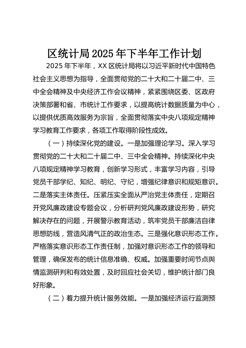 區(qū)統(tǒng)計局2025年下半年工作計劃2025年下半年,XX區(qū)統(tǒng)計局將以習(xí)近平新時代中國特色社會主義思想為指導(dǎo),全面貫徹黨的二十大和二十屆二中、三中全會精神及中央經(jīng)濟(jì)工作會議精神,緊緊圍繞區(qū)委、區(qū)政府決策部署和省、市統(tǒng)計工作要求,以提高統(tǒng)計數(shù)據(jù)質(zhì)量為中心,以提供優(yōu)質(zhì)高效服務(wù)為宗旨,全面貫徹落實中央八項規(guī)定精神學(xué)習(xí)教育工作要求,各項工作取得階段性成效。(一)持續(xù)深化黨的建設(shè)。一是加強(qiáng)理論學(xué)習(xí)。深入學(xué)習(xí)貫徹黨的二十大和二十屆二中、三中全會精神。持續(xù)深化中央八項規(guī)定精神學(xué)習(xí)教育,創(chuàng)新學(xué)習(xí)形式,豐富學(xué)習(xí)內(nèi)容,引導(dǎo)黨員干部學(xué)紀(jì)、知紀(jì)、明紀(jì)、守紀(jì),增強(qiáng)...