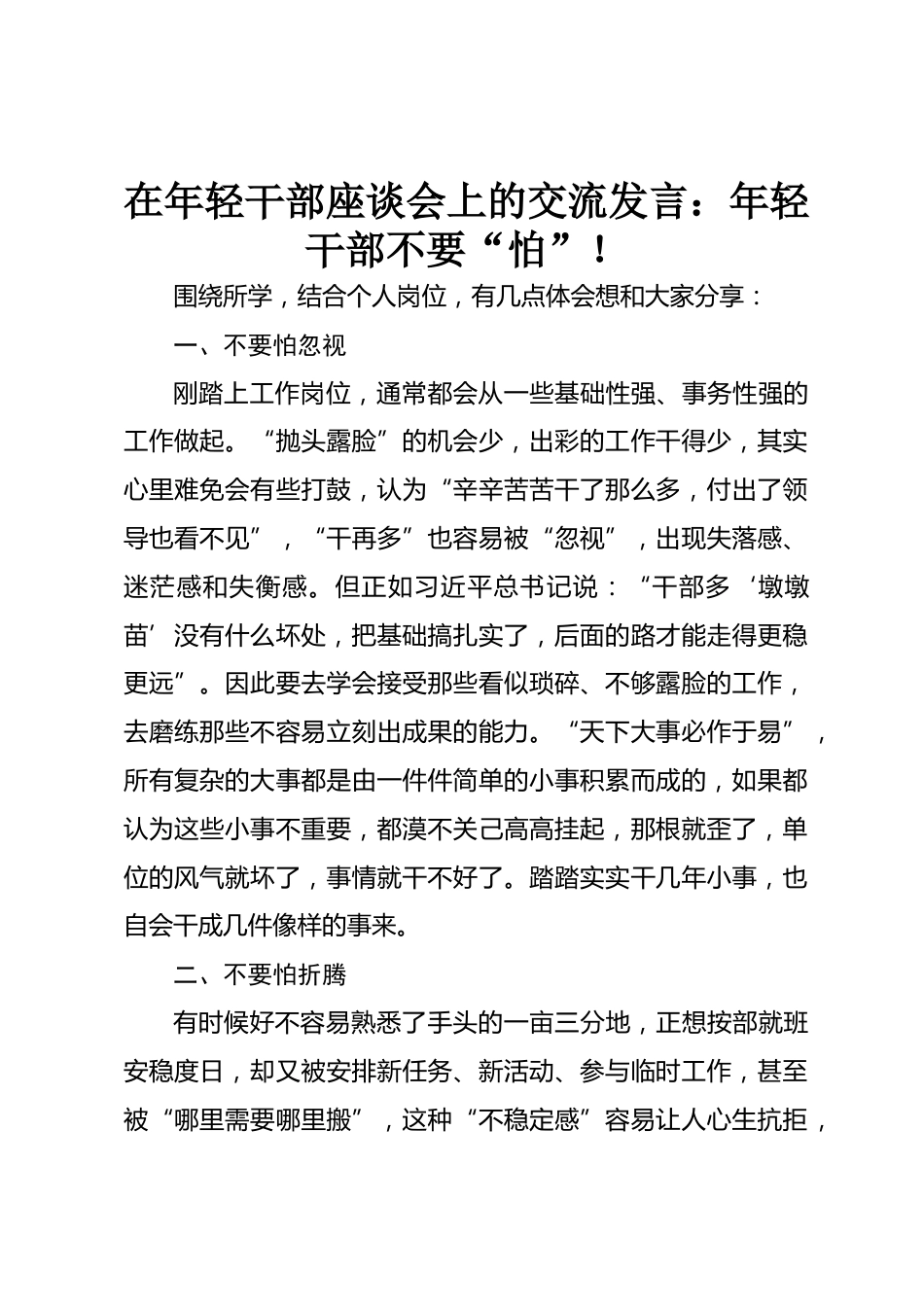 在年輕干部座談會(huì)上的交流發(fā)言:年輕干部不要“怕”!圍繞所學(xué),結(jié)合個(gè)人崗位,有幾點(diǎn)體會(huì)想和大家分享:一、不要怕忽視剛踏上工作崗位,通常都會(huì)從一些基礎(chǔ)性強(qiáng)、事務(wù)性強(qiáng)的工作做起?!皰侇^露臉”的機(jī)會(huì)少,出彩的工作干得少,其實(shí)心里難免會(huì)有些打鼓,認(rèn)為“辛辛苦苦干了那么多,付出了領(lǐng)導(dǎo)也看不見(jiàn)”,“干再多”也容易被“忽視”,出現(xiàn)失落感、迷茫感和失衡感。但正如習(xí)近平總書(shū)記說(shuō):“干部多‘墩墩苗’沒(méi)有什么壞處,把基礎(chǔ)搞扎實(shí)了,后面的路才能走得更穩(wěn)更遠(yuǎn)”。因此要去學(xué)會(huì)接受那些看似瑣碎、不夠露臉的工作,去磨練那些不容易立刻出成果的能力?!疤煜麓笫卤?..