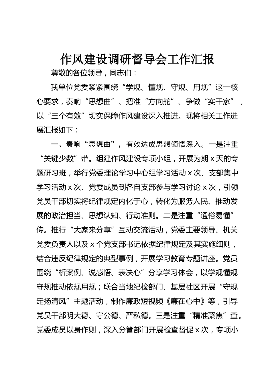 作風(fēng)建設(shè)調(diào)研督導(dǎo)會工作匯報(bào)尊敬的各位領(lǐng)導(dǎo),同志們:我單位黨委緊緊圍繞“學(xué)規(guī)、懂規(guī)、守規(guī)、用規(guī)”這一核心要求,奏響“思想曲”、把準(zhǔn)“方向舵”、爭做“實(shí)干家”,以“三個(gè)有效”切實(shí)保障作風(fēng)建設(shè)深入推進(jìn)?,F(xiàn)將相關(guān)工作進(jìn)展匯報(bào)如下:一、奏響“思想曲”,有效達(dá)成思想領(lǐng)悟深入。一是注重“關(guān)鍵少數(shù)”帶。組建作風(fēng)建設(shè)專項(xiàng)小組,開展為期x天的專題研習(xí)班,舉行黨委理論學(xué)習(xí)中心組學(xué)習(xí)活動x次、支部集中學(xué)習(xí)活動x次、黨委成員到各自支部參與學(xué)習(xí)討論x次,引領(lǐng)黨員干部切實(shí)將紀(jì)律規(guī)定內(nèi)化于心,轉(zhuǎn)化為服務(wù)人民、推動發(fā)展的政治擔(dān)當(dāng)、思想認(rèn)知、行動準(zhǔn)則。二是注重“通...